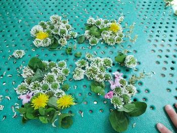 この活動をしている時、ふと思い出したのが5月頃、園の棚田で草花遊びをしていた女の子たちのことです。摘んだ草花を総合遊具の穴のあいた鉄板に差し込み、草花アートを楽しんでいました。今遊んでいる「モザイクアート」と同じですね。身近な環境を自分たちの生活や遊びの中に取り入れていく子どもたちの発想力・思考力そして、柔らかな心にはいつも感心させられます。