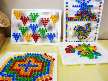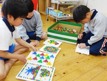 頑張った子どもたちに保護者の皆様からプレゼントをいただきました。年長児は「モザイクアート」☆ 赤・青・黄・緑の色とりどりのペグを白いボードに挿してイメージを描いていくものです。中でも子どもに人気があるのは、透明でキラキラ光るペグです。何百個もあるペグの中から”ダイヤモンドみーつけた”と言いながら探し出し、アートを楽しみます。いつも思うことですが「子どもの発想はすばらしい!」指先を巧みに動かし、柔らかな感性で見る見る間に自分のイメージをボードの上に広げていきます。ステキなアートがたくさんできました。