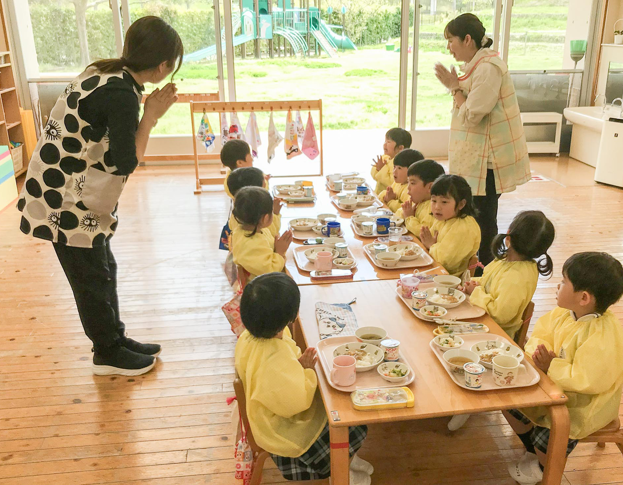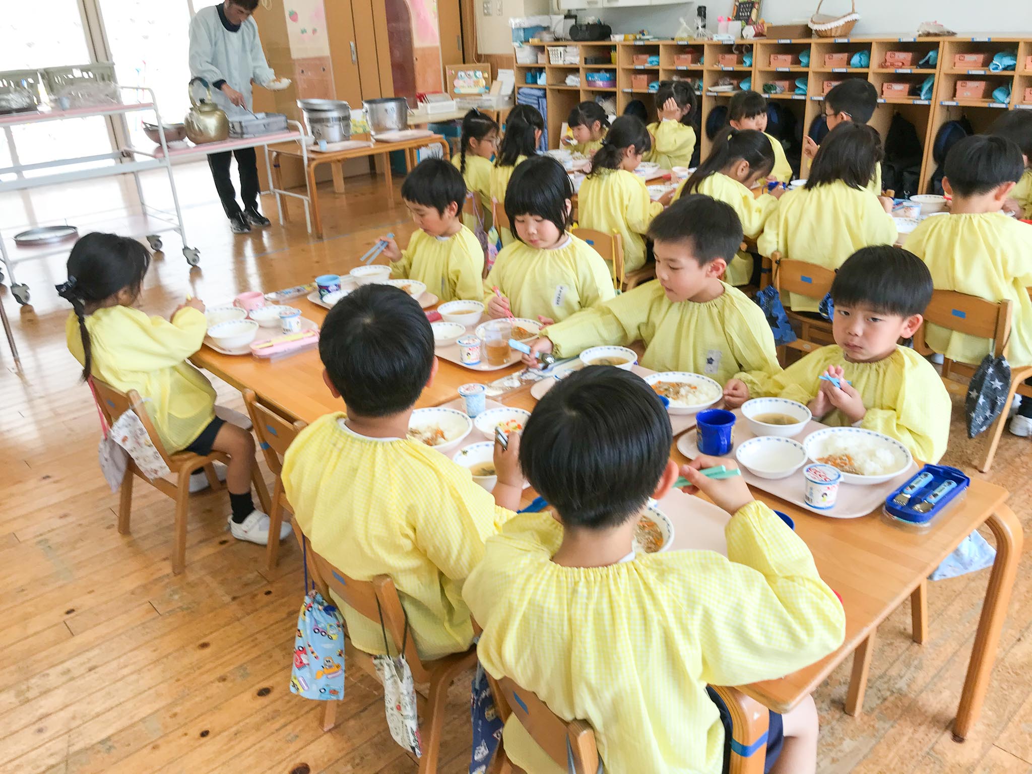 年少組では、初めて給食を体験する子どもたちもたくさんいましたが、戸惑いながらも、お友達と一緒に食事の時間を過ごすことができました。これからもできたてのおいしい給食を、みんなで楽しくいただきましょう!