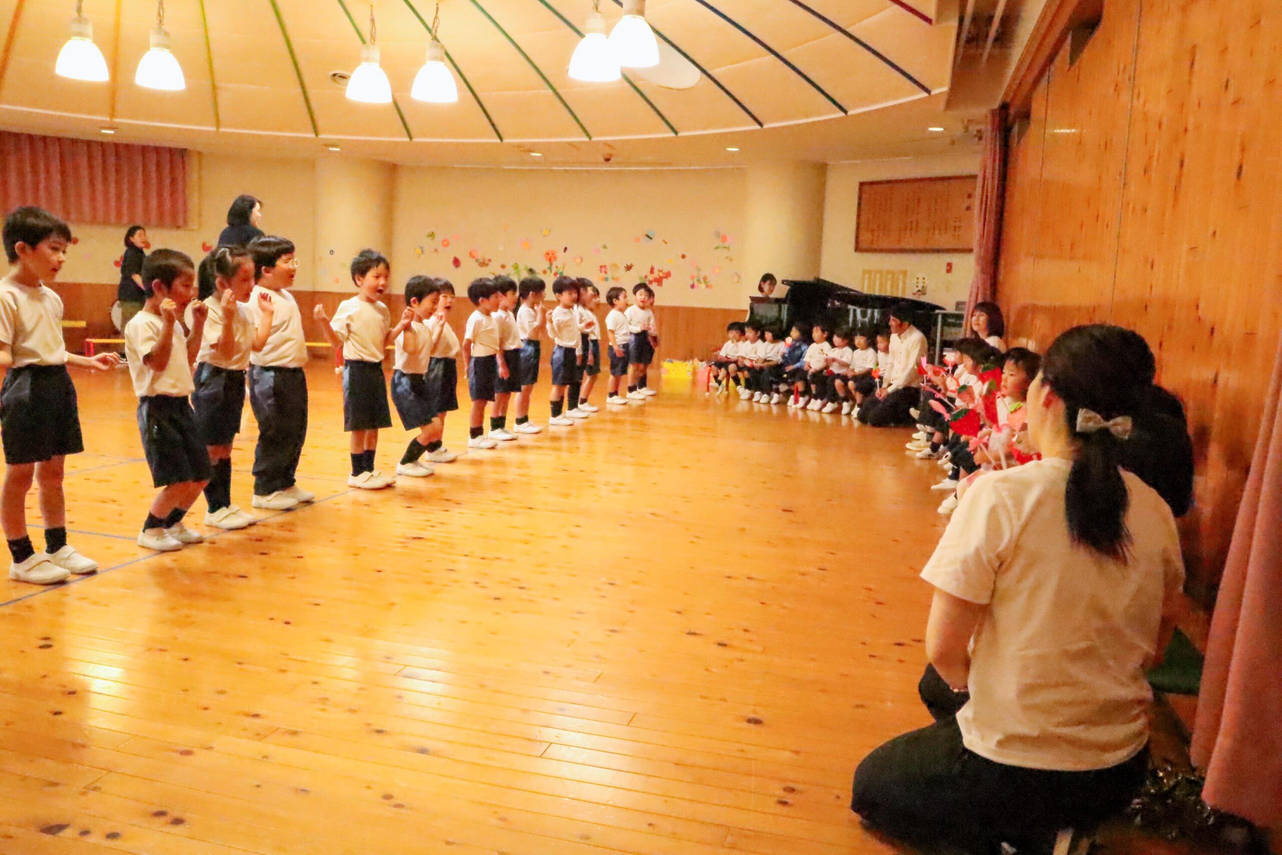 退場の際には、年長・年中組のお友だちと笑顔でハイタッチをかわし、みんなすっかり仲良くなったみたいです。