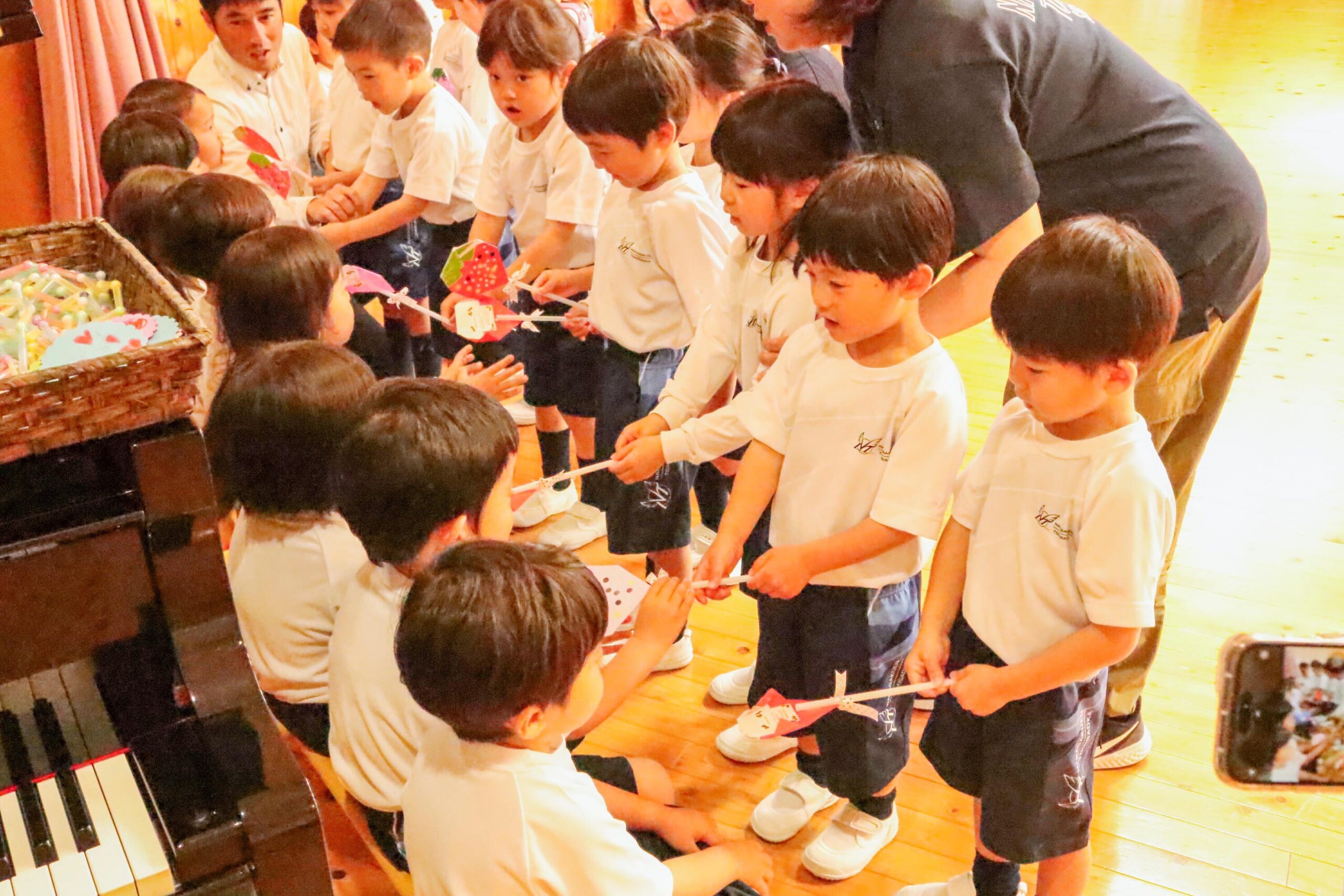 次に年中組の園児たちが、いちご組と年少組の園児たちに手作りのいちごのおもちゃを手渡しました。年長組の園児は、歌のプレゼントとして「世界中のこどもたち」を合唱し、手作りのかわいいネックレスをいちご組と年少組の園児たちにかけました。
