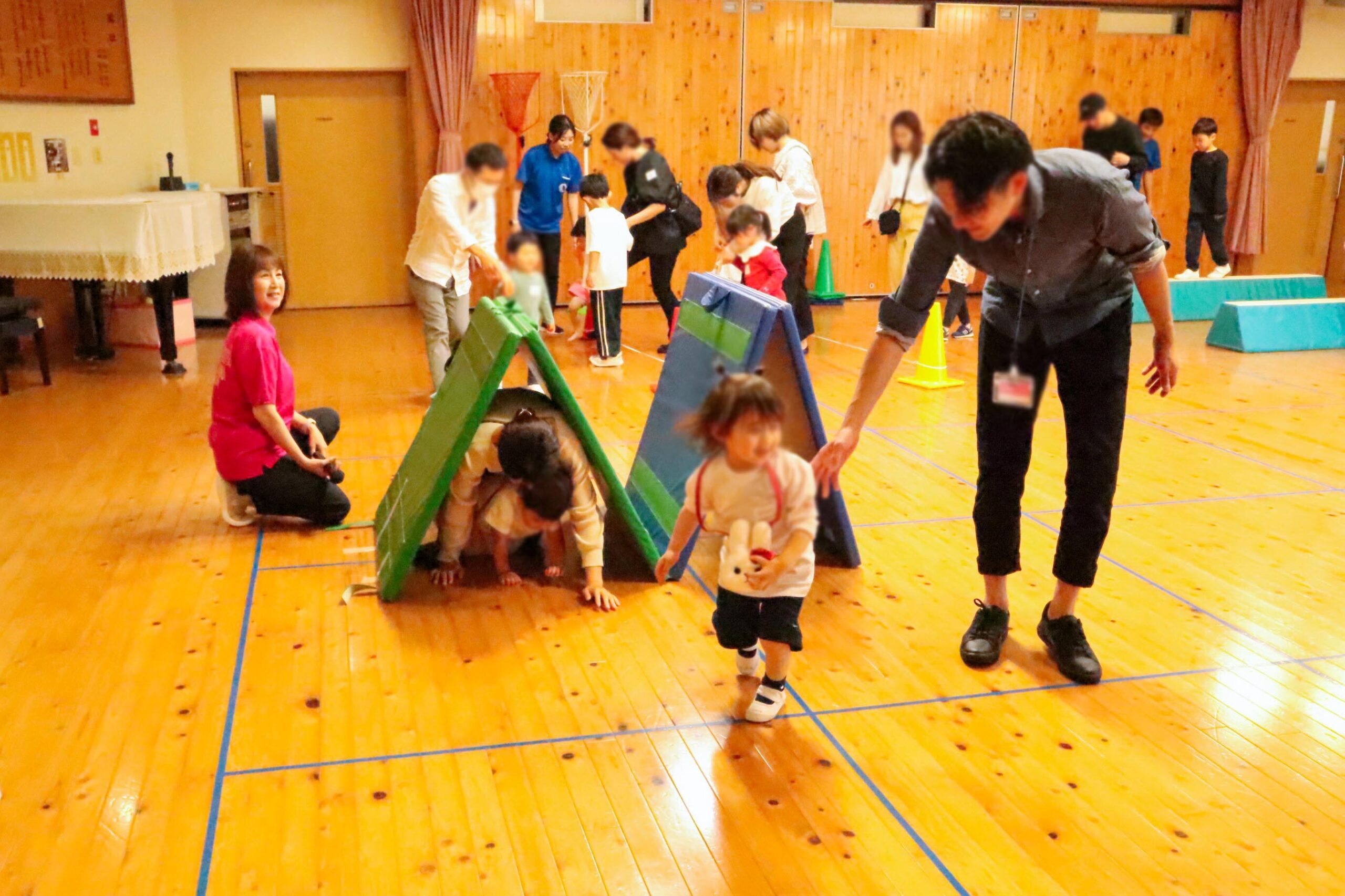 次に、マットのトンネルや平均台、カラーコーンをジグザクで進むコースなどが設置されたサーキットに挑戦。お母さんやお父さんと一緒に楽しみました。