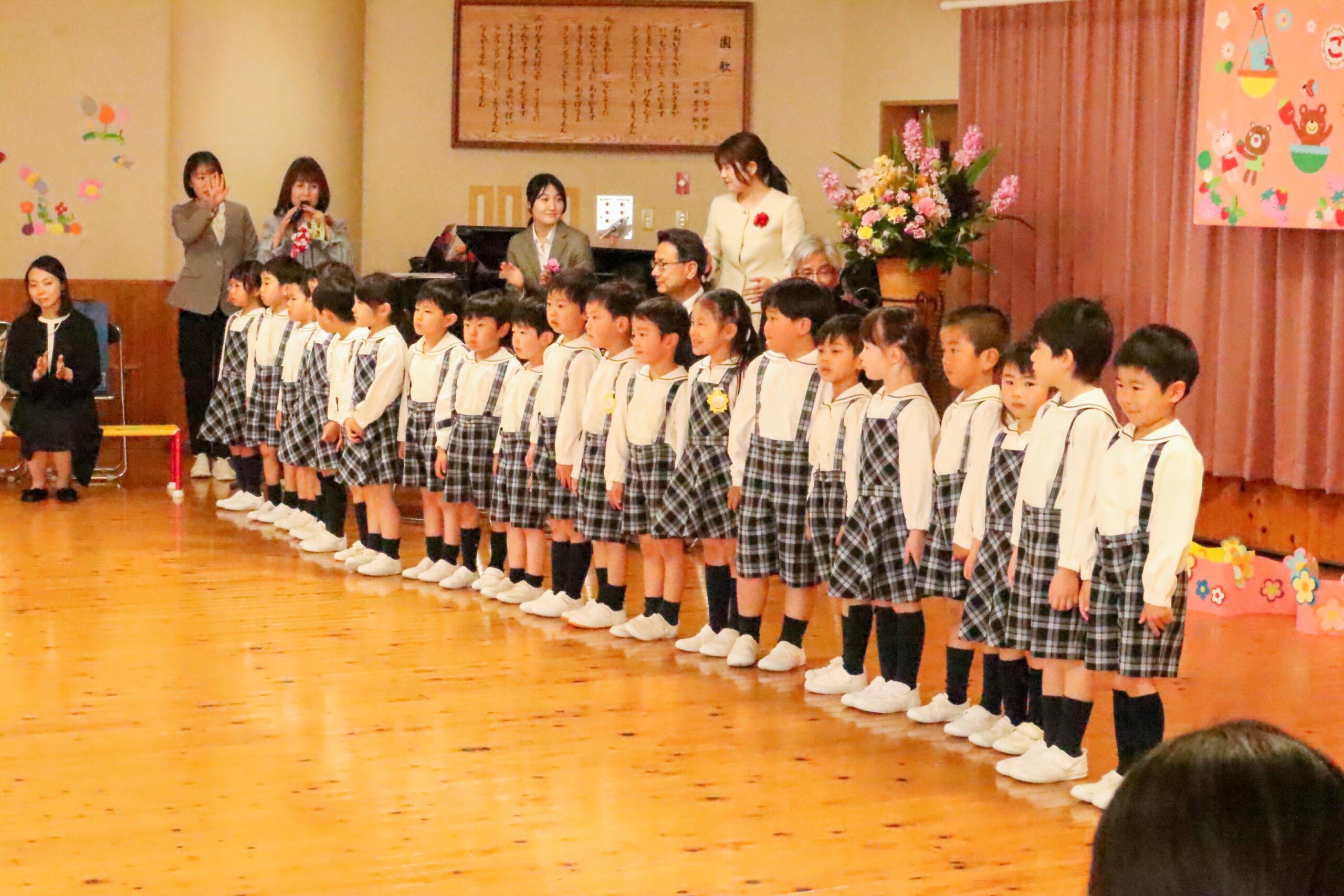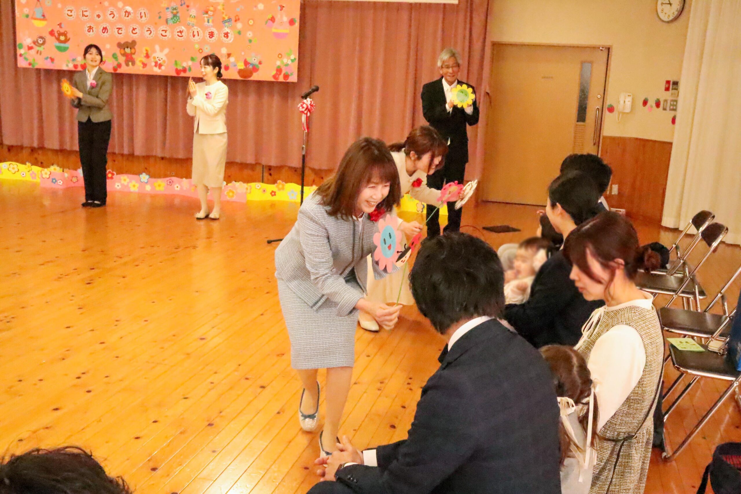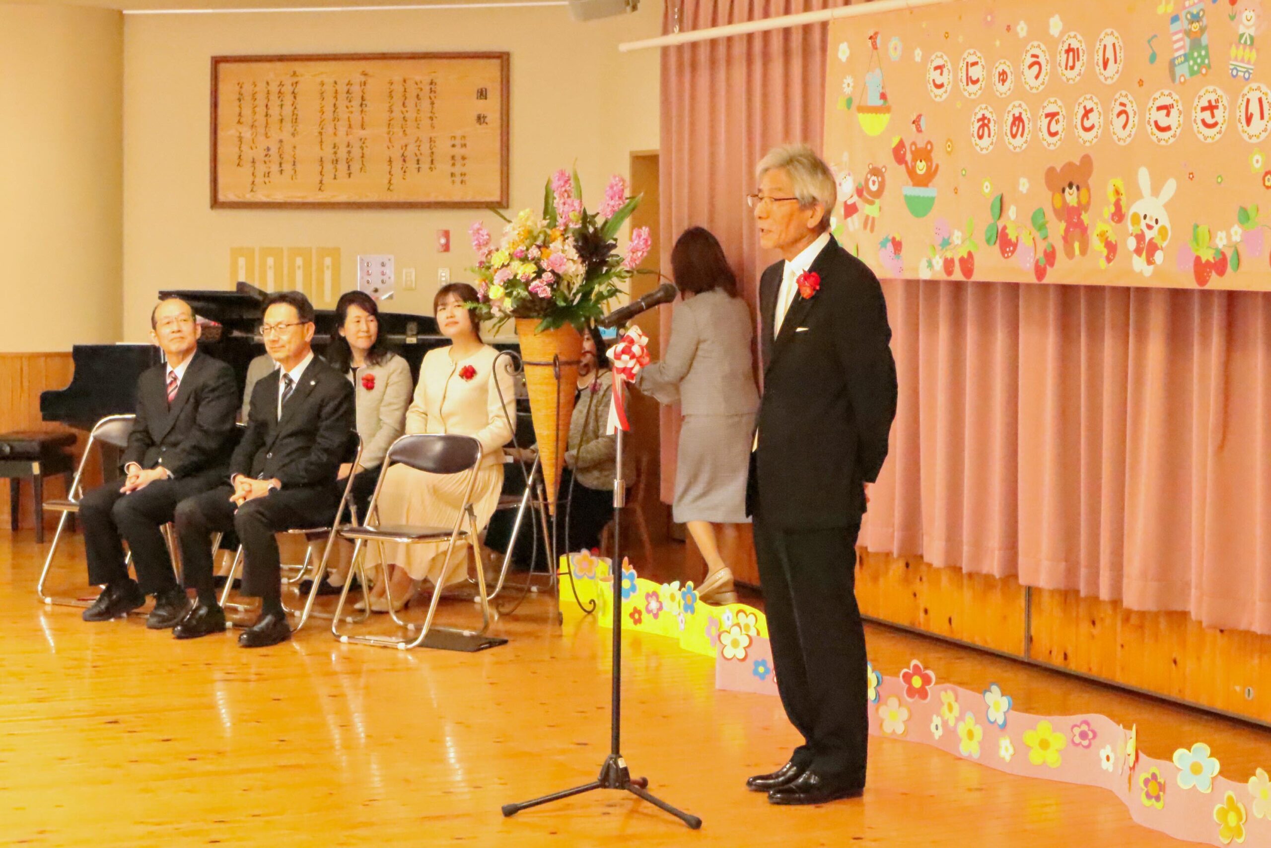 槇園長からは「先生もみんなが来るのを楽しみに待っていました。楽しく遊びながらいろんなことを見つけてください」と、子どもたちへあたたかな言葉が送られました。保護者の方へは「お子様を小さな旅に送り出してくださり、ありがとうございます」と感謝が伝えられました。