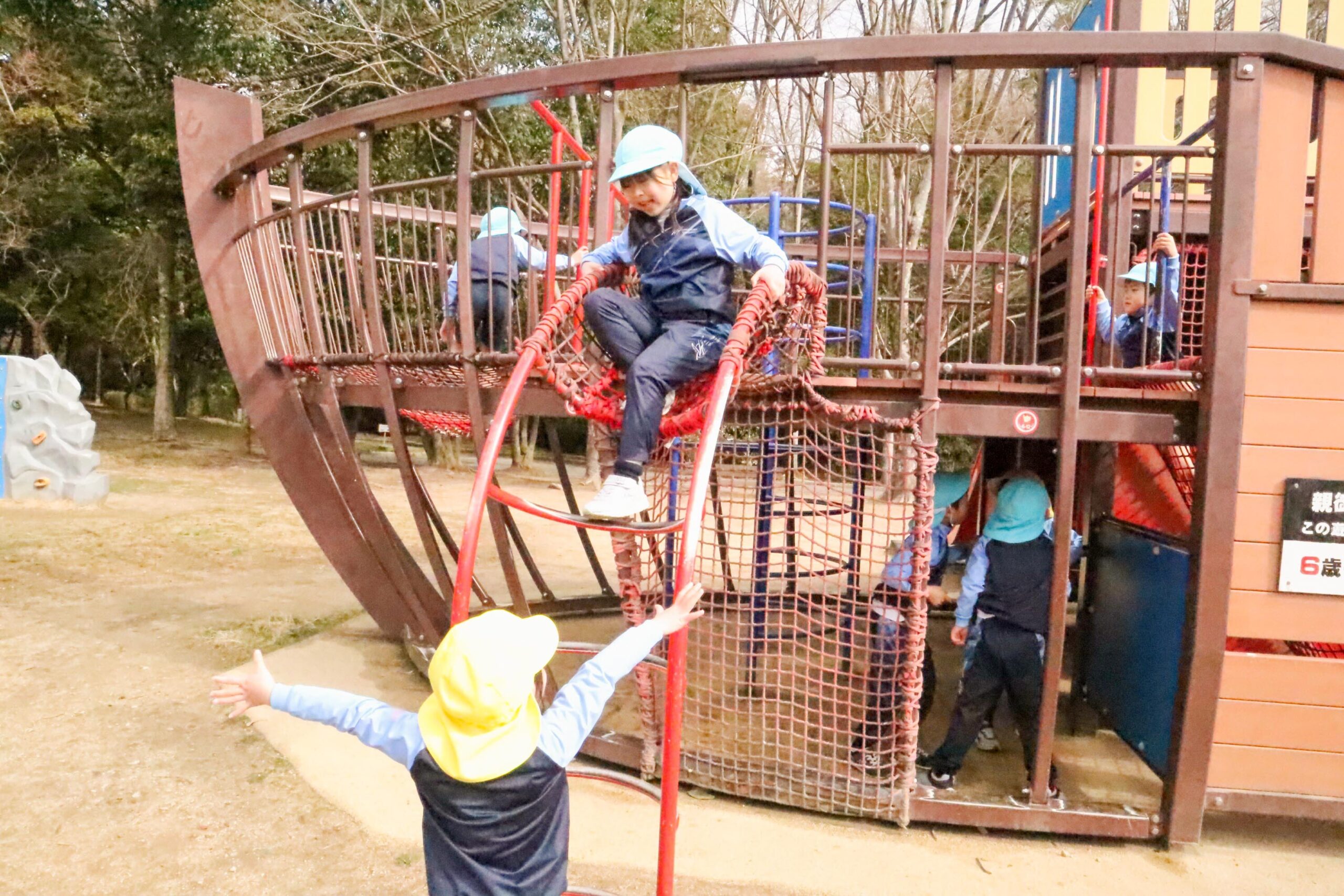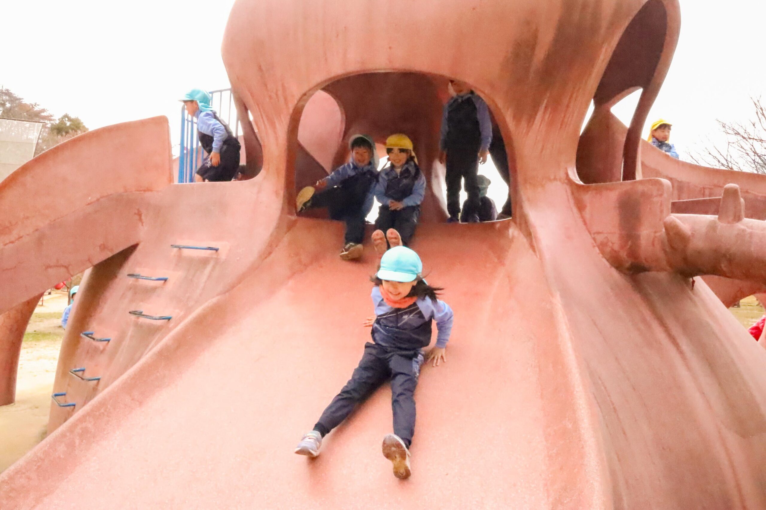 到着すると、さっそくタコの形をした大きな滑り台や海賊船の形をしたアスレチック遊具へ走って行きました。タコ形滑り台では、壁面の階段を登って一番高い所からお友だちに手を振ったり、胴体のトンネルをくぐって滑り台を繰り返し滑ったりと大興奮。かくれんぼをして遊ぶ姿も見られました。海賊船形のアスレチックでは、ロープを伝って登ったり、舵取りをしながら船長になりきったり、パイプを使って電話のようにしゃべり合って遊んでいました。