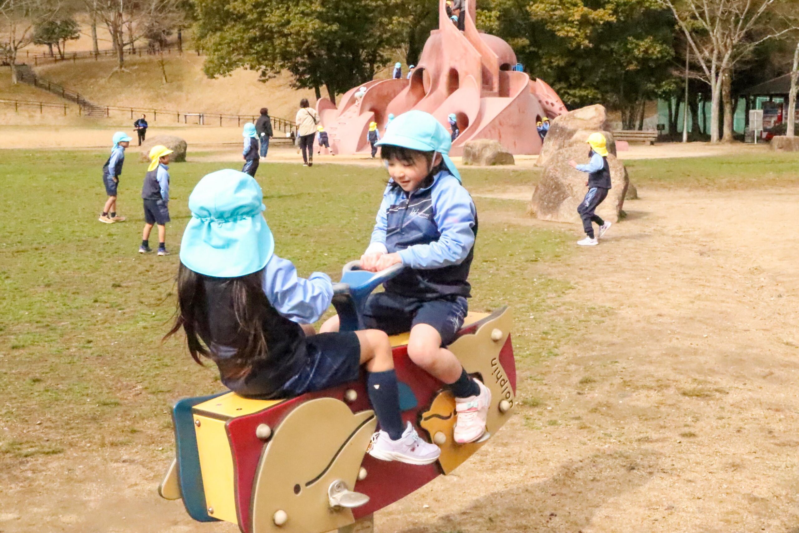 広場ではスプリング遊具や鬼ごっこ、かけっこを楽しんでいました。