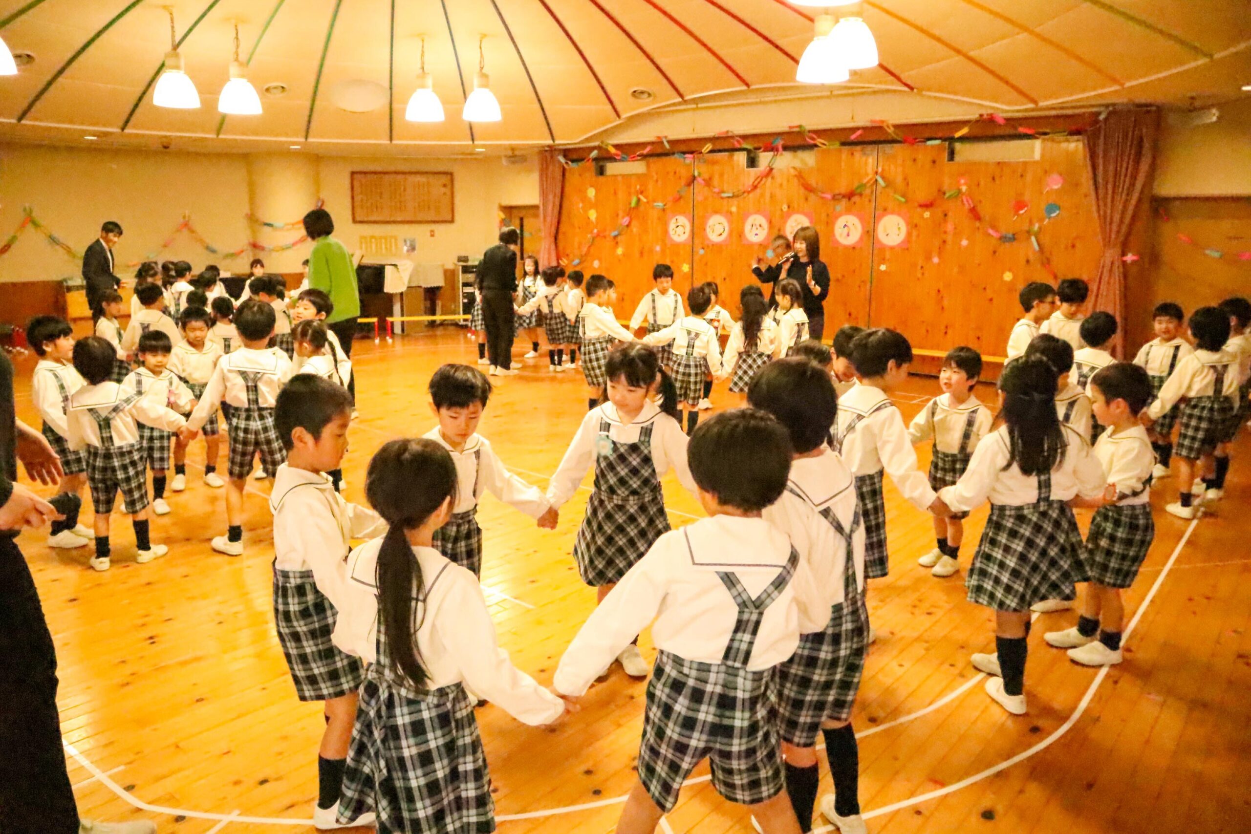 会のはじめには園長先生のお話があり、続いて遊戯室いっぱいに広がって、みんなで一緒にふれあい遊びを楽しみました。大きな輪になって歌ったり、踊ったり体を思いっきり動かして遊びました。