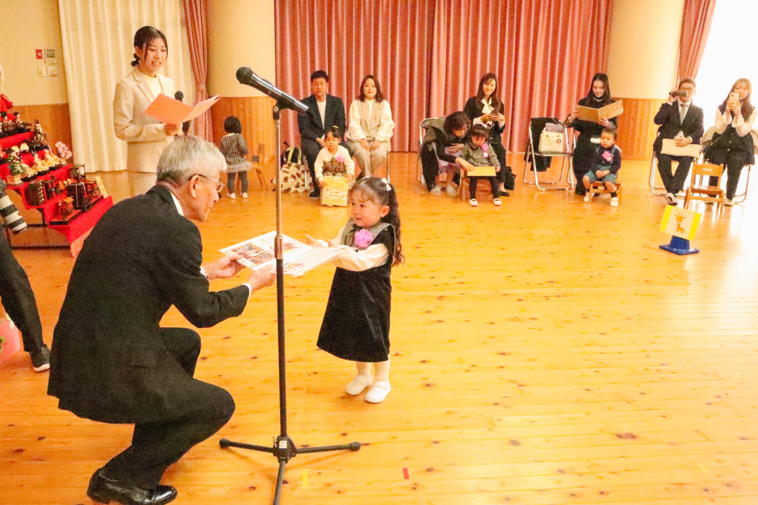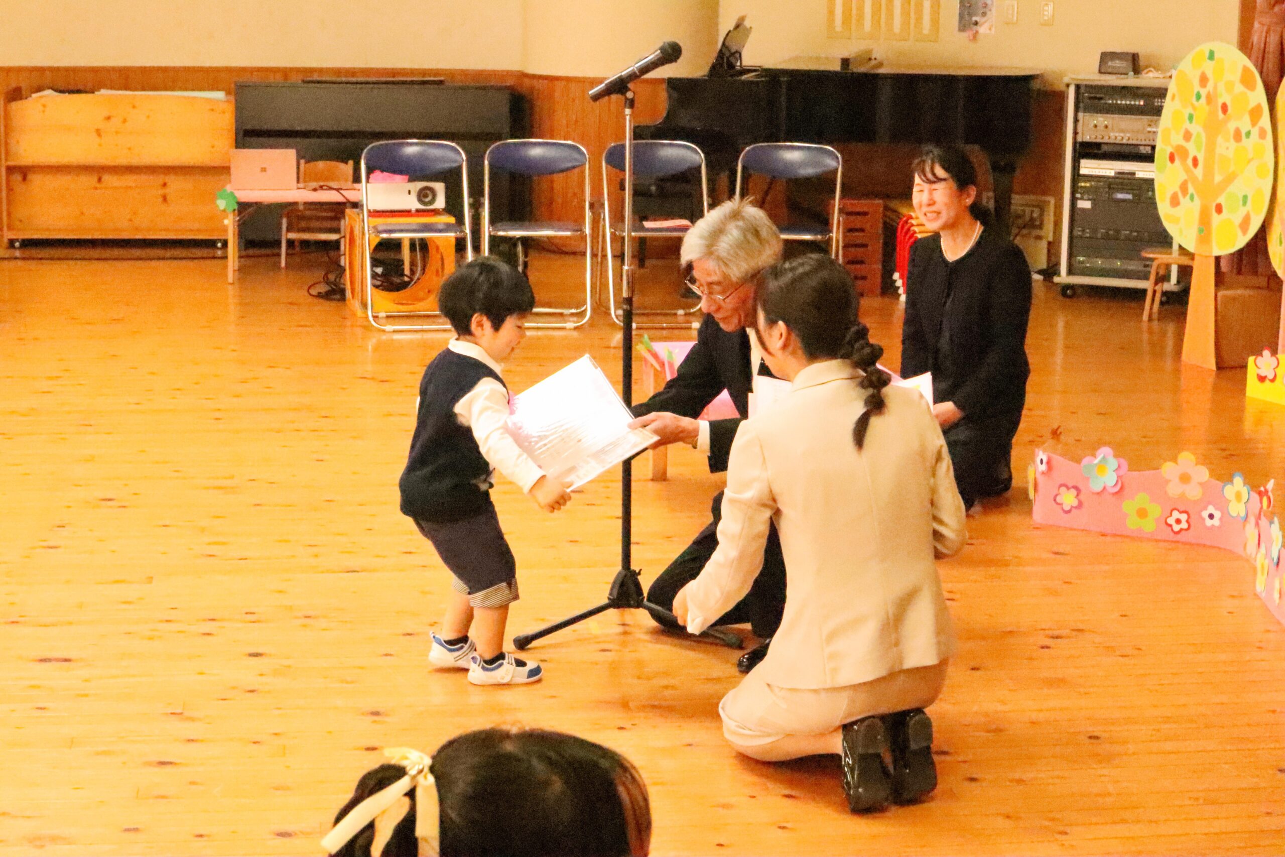開式の辞の後、いちご組終了書の授与が始まりました。ひとりずつ名前を呼ばれ、前に出た子どもたちは、槇園長から「おめでとう」の言葉と一緒に終了書が手渡されました。