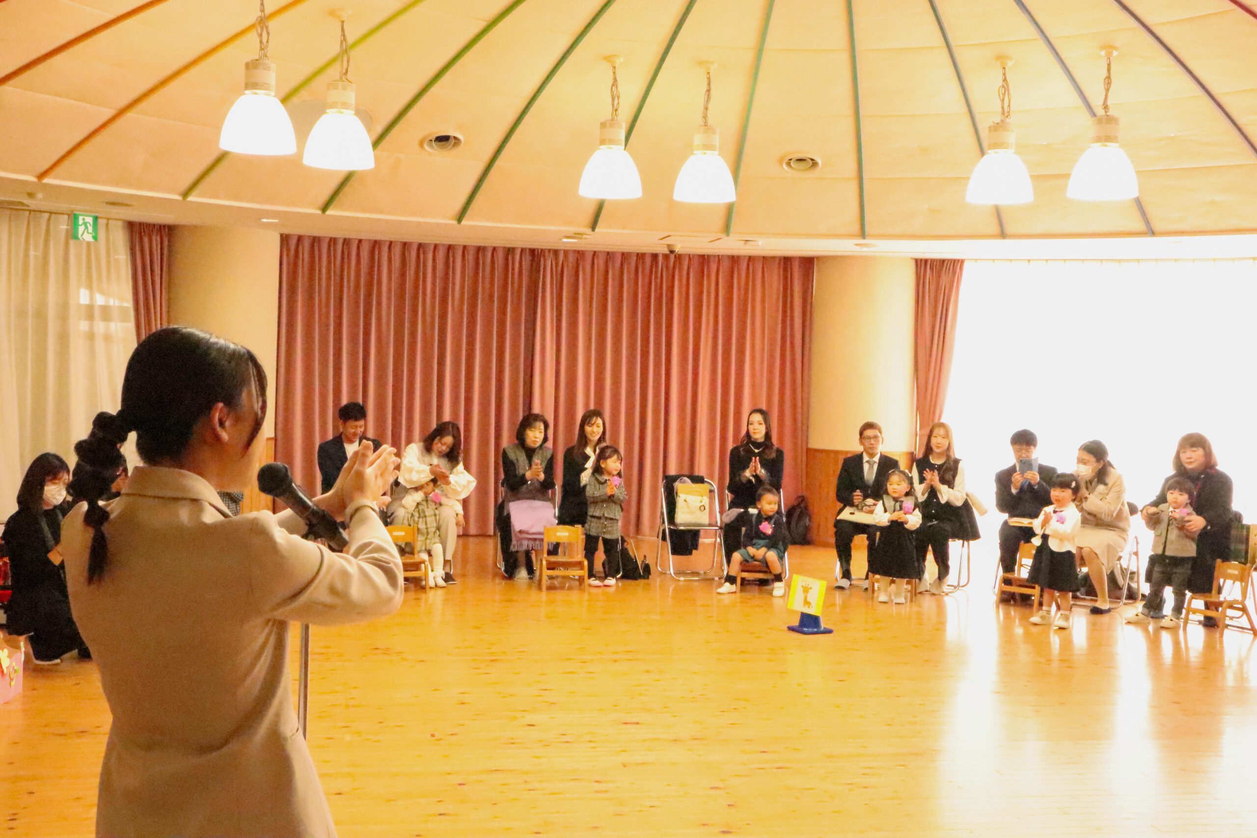 槇園長から「4月に入会した時は、本当に幼かったみんなですが、今ではちゃんとお話も聞いてくれるようになったし、しっかりお返事もできるようになりましたね。できなかったことが、どんどんできるようになりました。いちご組での体験が、みんなの根っことなってくれると信じています。これからもニコニコ、ワクワクするような毎日を送ってください」とお話がありました。続いて、いちご組での1年間の思い出写真を、スライドショーで見ました。
