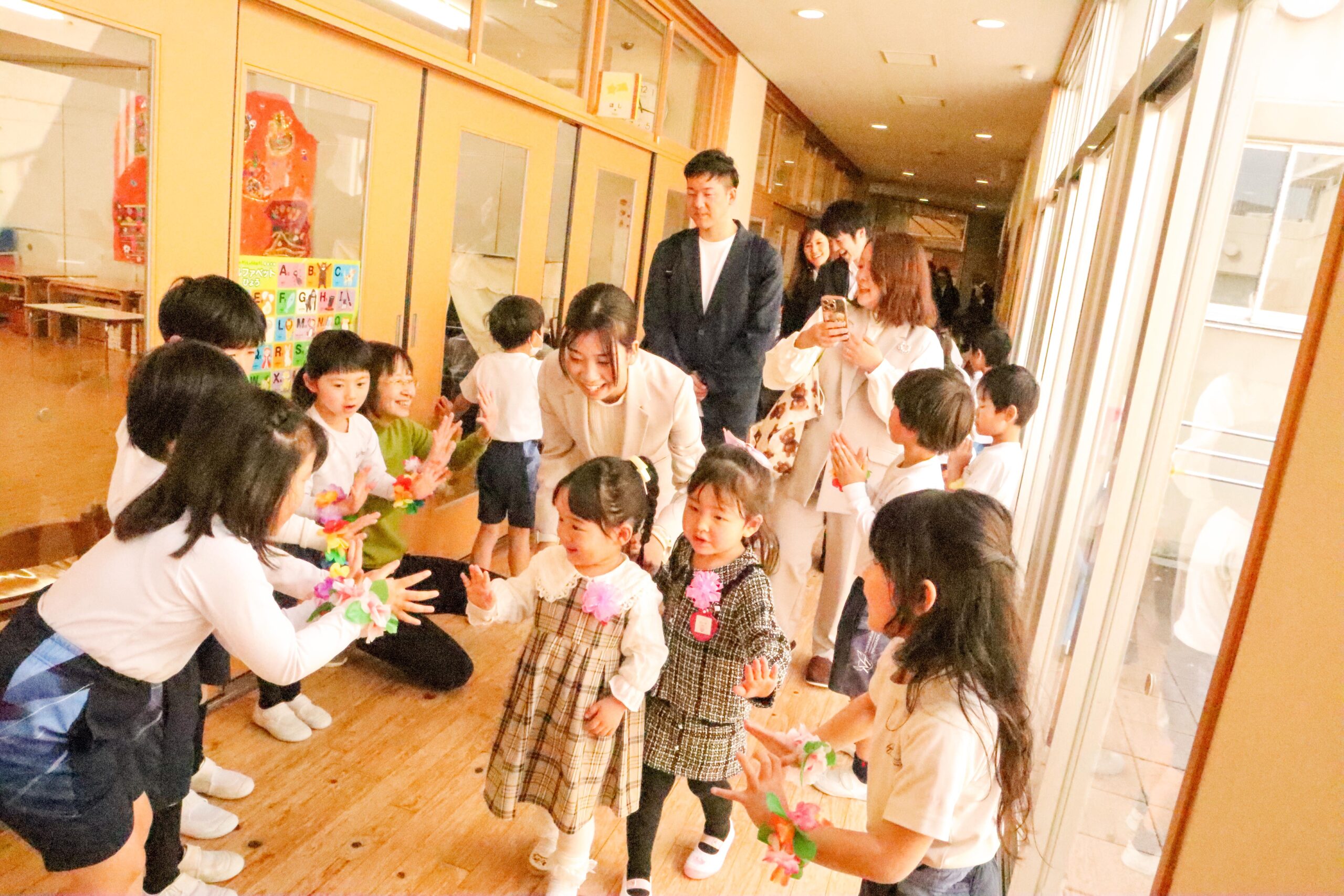 遊戯室を出ると、玄関まで在園児たちが並び、大きな声で「おめでとう!」と手を振りながら見送ってくれました。
