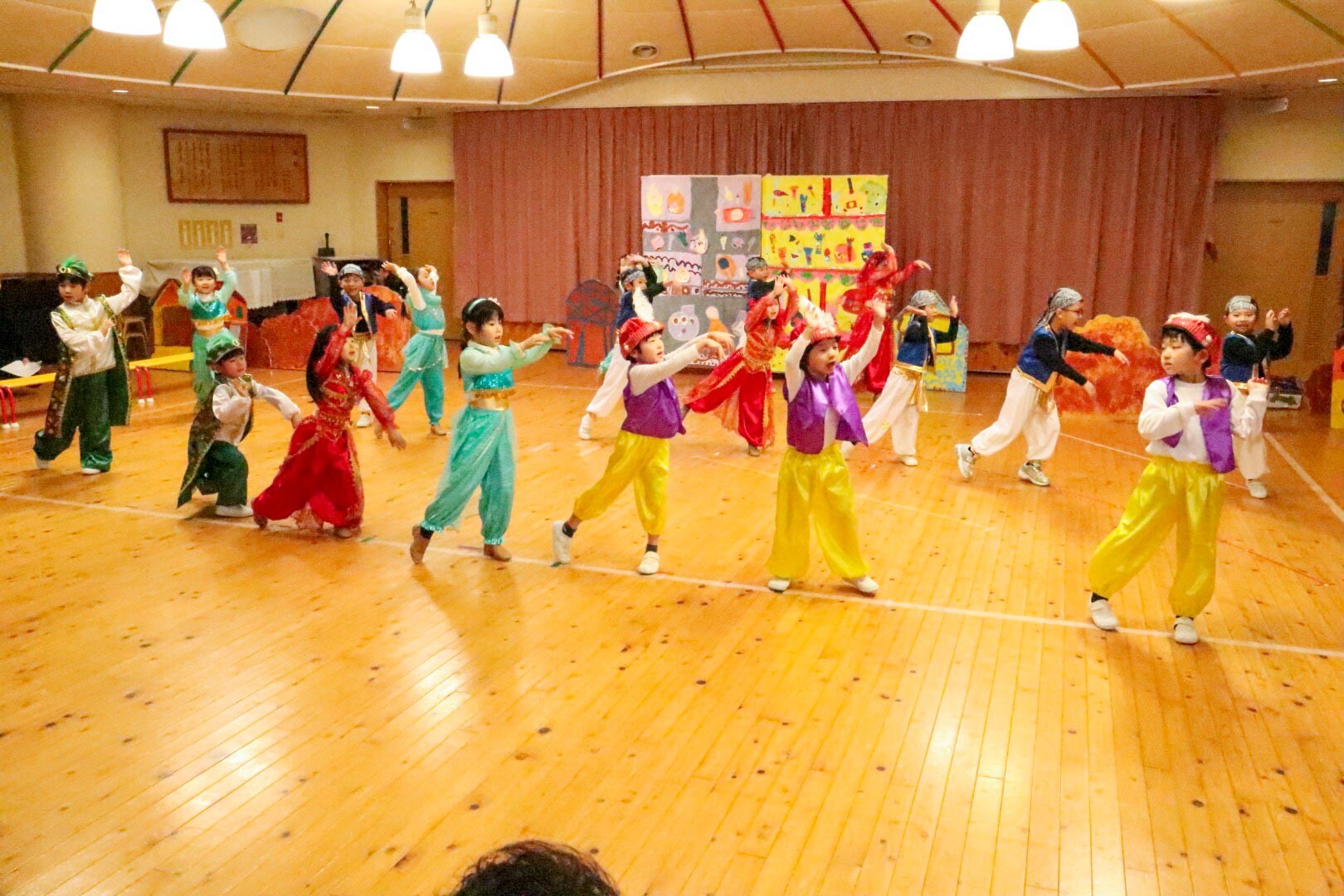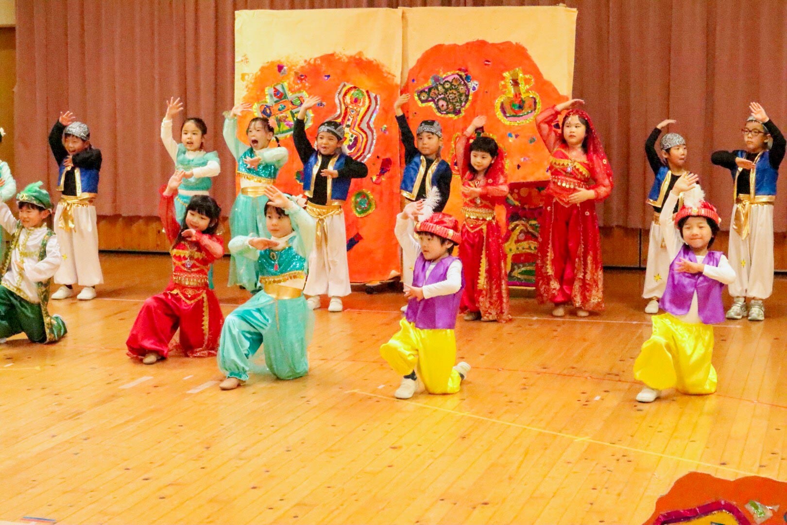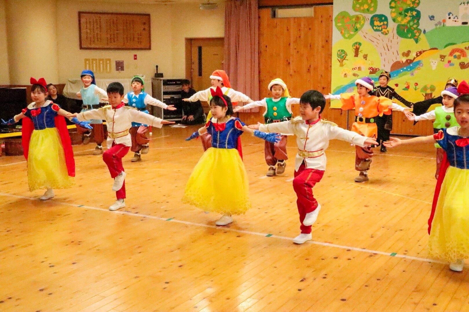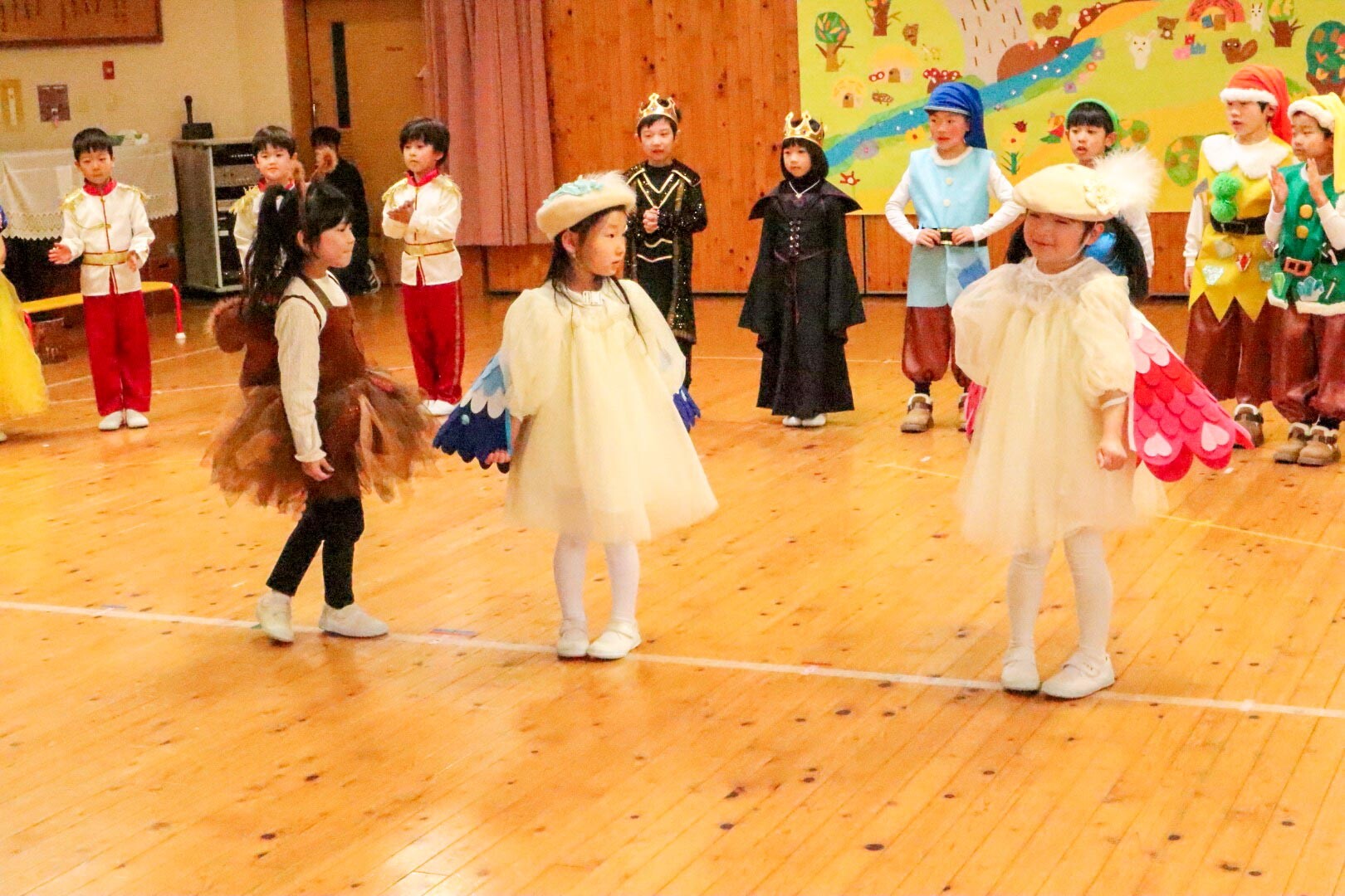 午後からは年長組の発表です。星組は『アリババと盗賊』を、空組は『白雪姫』を披露しました。年長の園児たちは、最後の発表会とあって台詞をしっかり覚え、登場人物になりきって表現していました。さらに、演目のダンスも息を合わせて上手に踊ることができました。