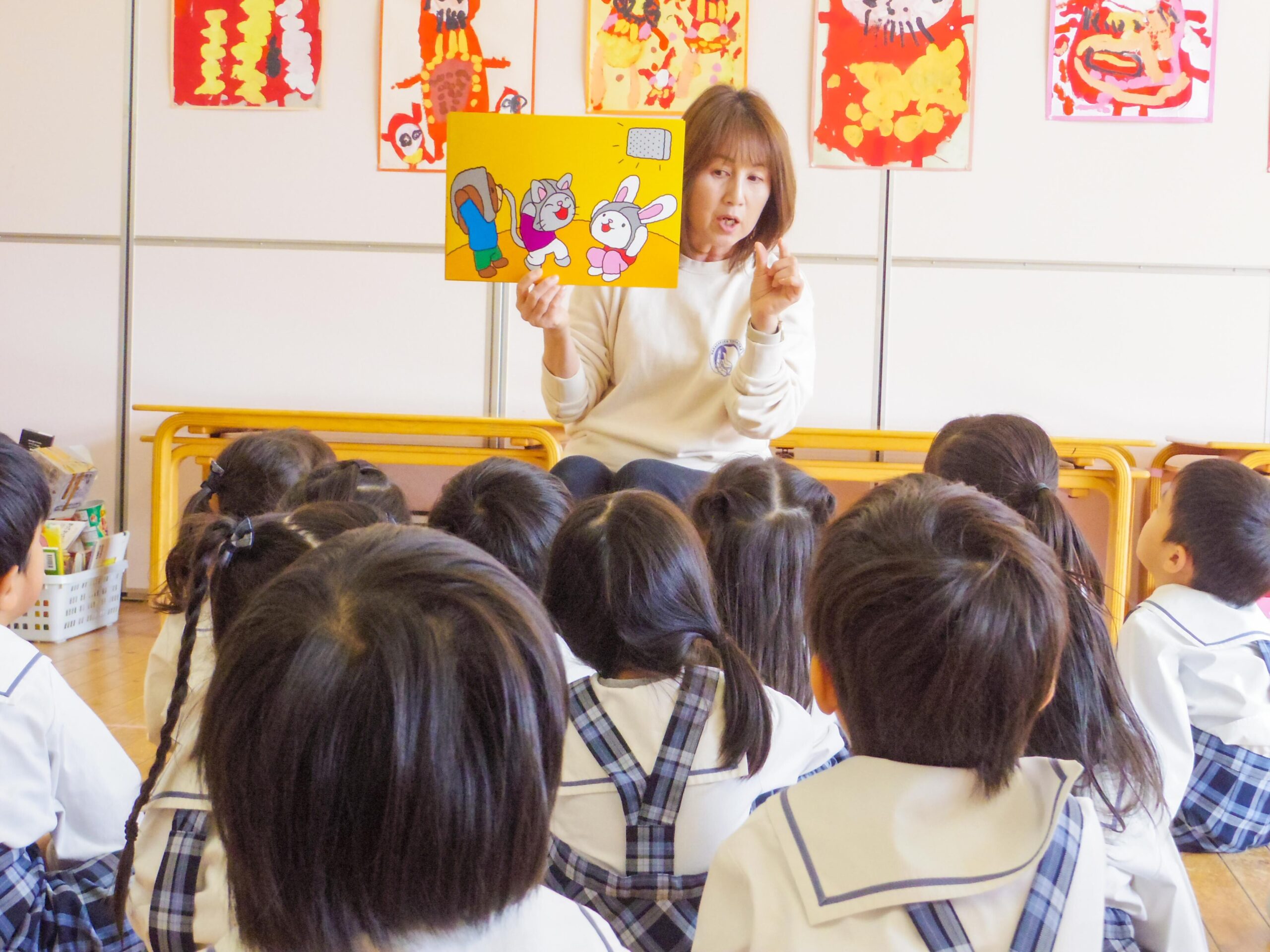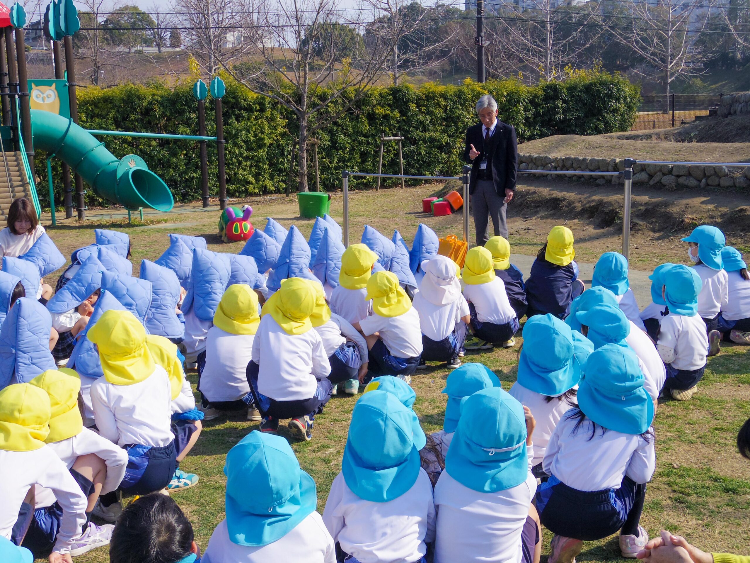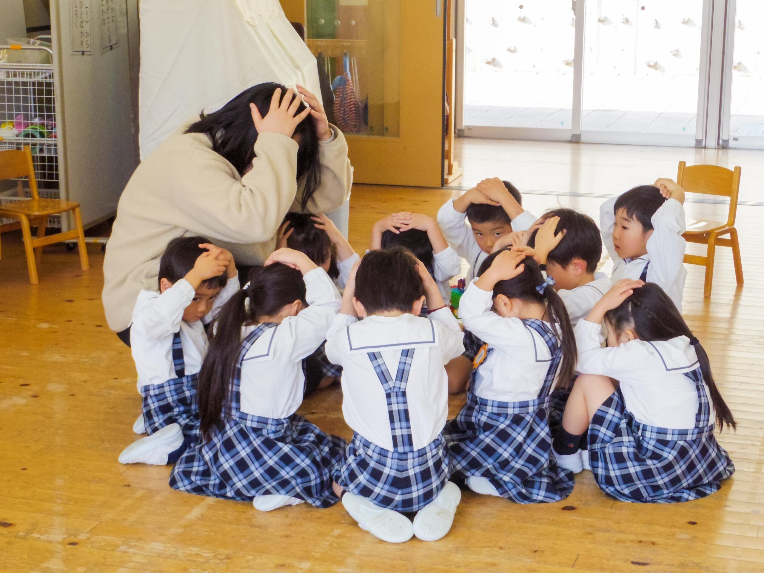 1月23日(木)、小中高の避難訓練に合わせて、幼稚園でも地震防火避難訓練を行いました。訓練の前に園児たちは地震が起きた時の行動を紙芝居で学び、頭を守るための「だんごむしのポーズ」を練習していました。