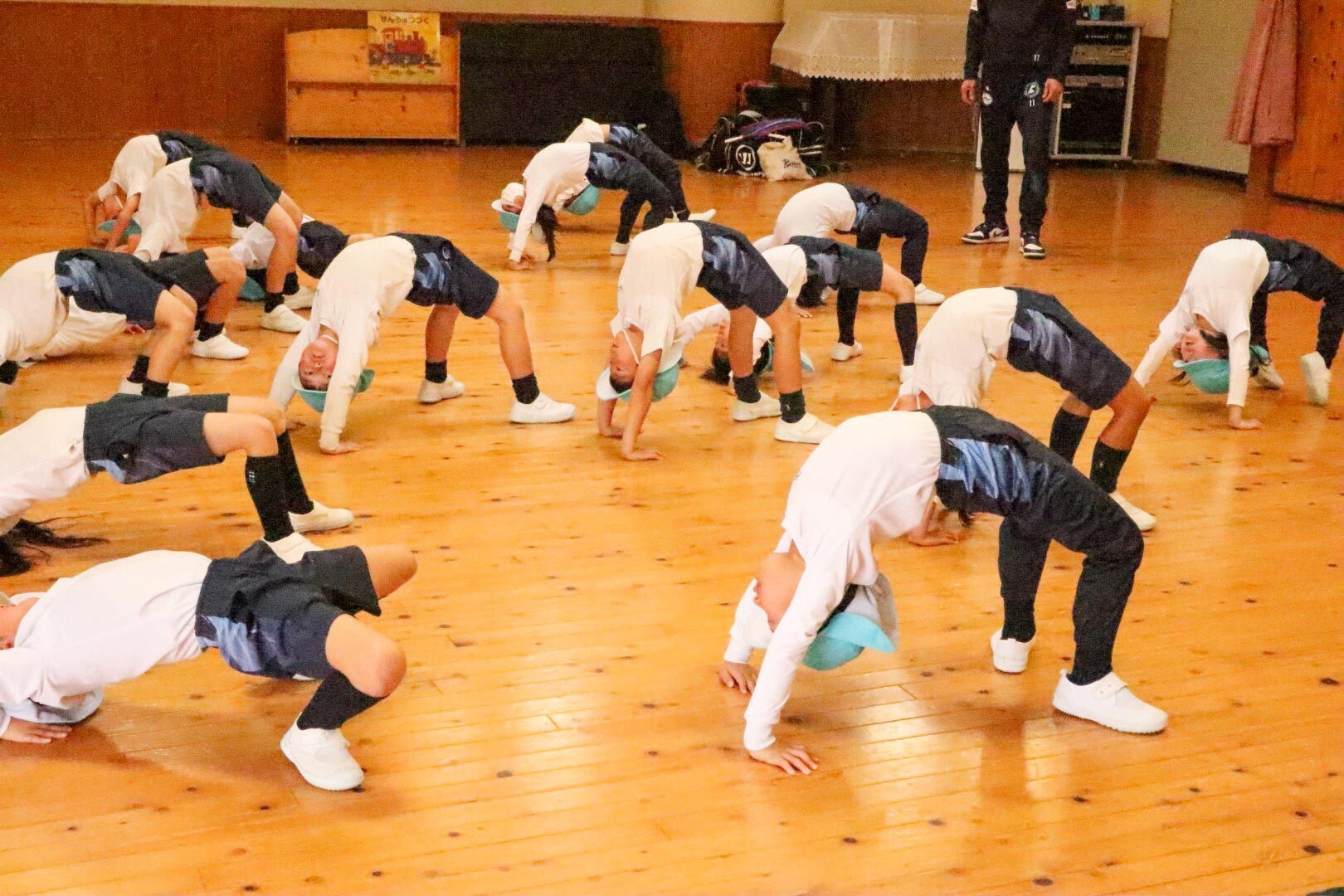 年少組はまず準備体操から始めました。スキップの練習をした後は、縄跳びやマット運動の練習をしました。