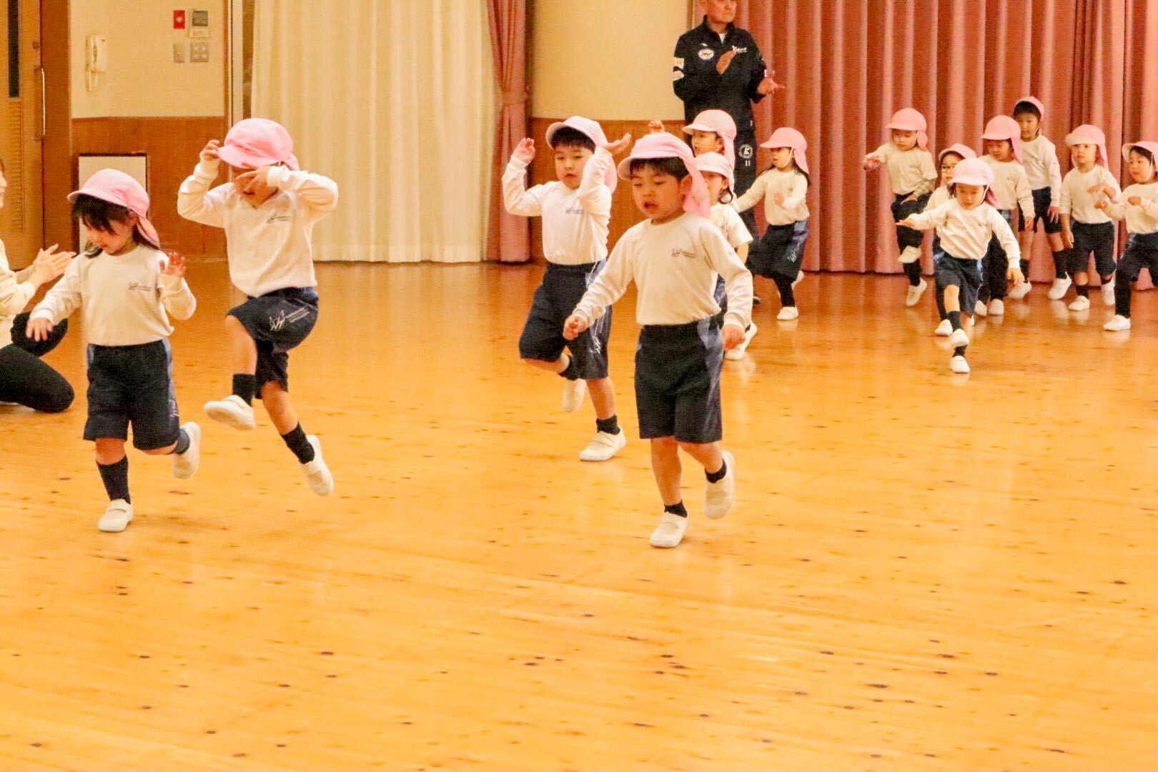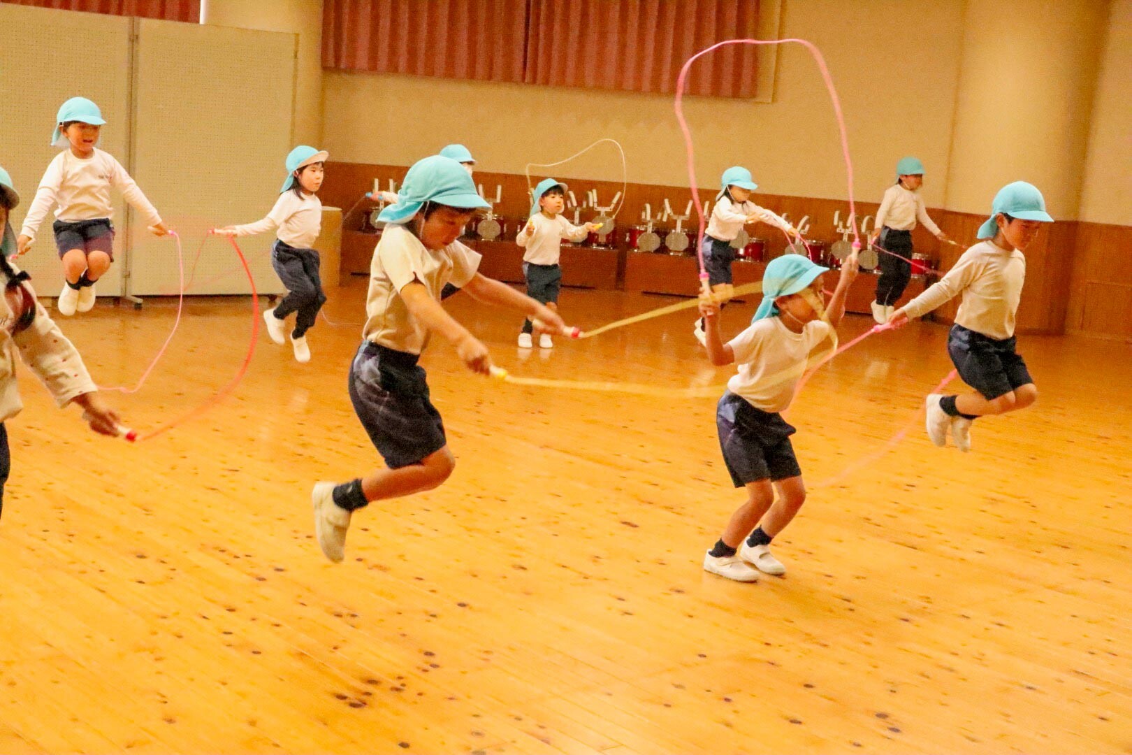 年長組は縄跳びチャンピオンに挑戦しました。縄跳びを跳び続けてひっかかった時点で座り、一番長く跳びつづけられたらチャンピオンです。最後2人の競い合いに、みんなからも「おお!すごい!」と声がかかっていました。そしてマット運動の後は、前スキップと後ろスキップをしました。先生から「スキップは競争ではありません。リズミカルに軽やかにやりましょう」と教えてもらいました。