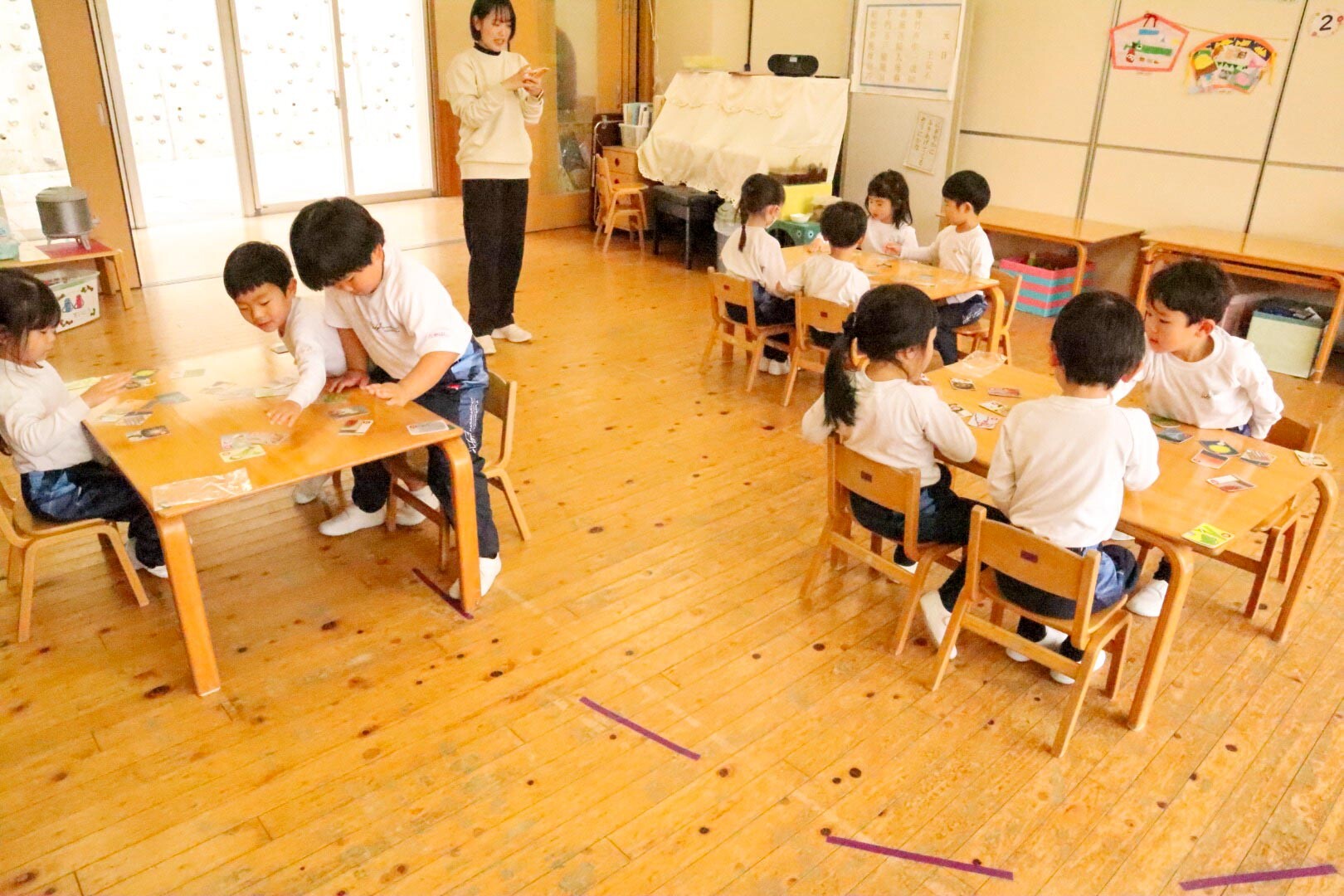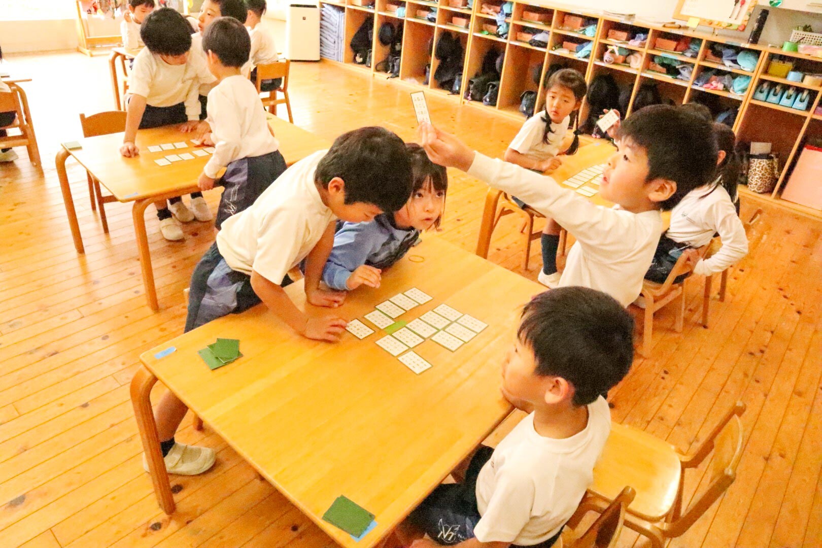 年長児は同じ読み始め言葉や、「きょう」を古語で「けふ」と書いた取り札もあり、ついお手付きする園児もいました。お手付きは1回休みなので、園児たちもだんだんと注意深く読み札を聞いてから取るようになりました。また先生が「ほし組の〜」と、百人一首にはない読み札をわざと読み上げると、「違う!違う!」とみんなで大笑いする場面もありました。
