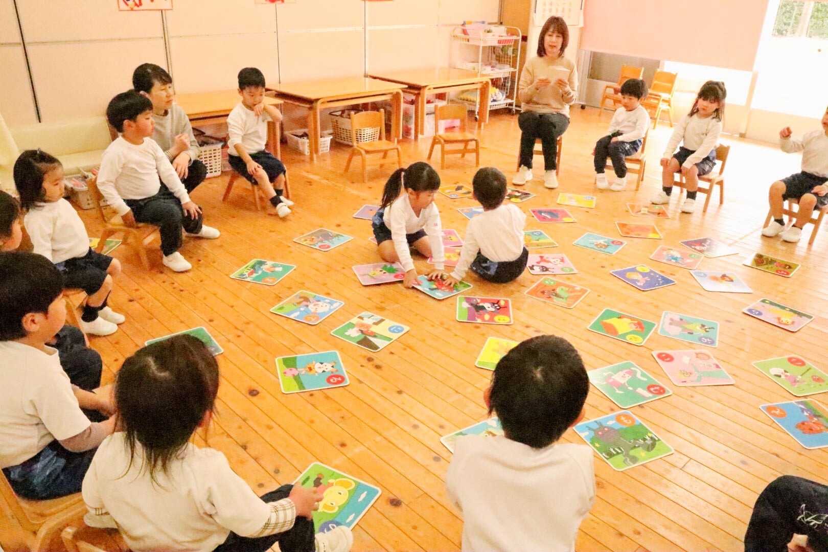 年中児はグループ毎に座り、先生が読み札を読み始めるなりその場に立ち上がって、かるた取りを競っていました。うまく取った園児は「はい!」と取ったかるたを手に掲げて先生に見せていました。