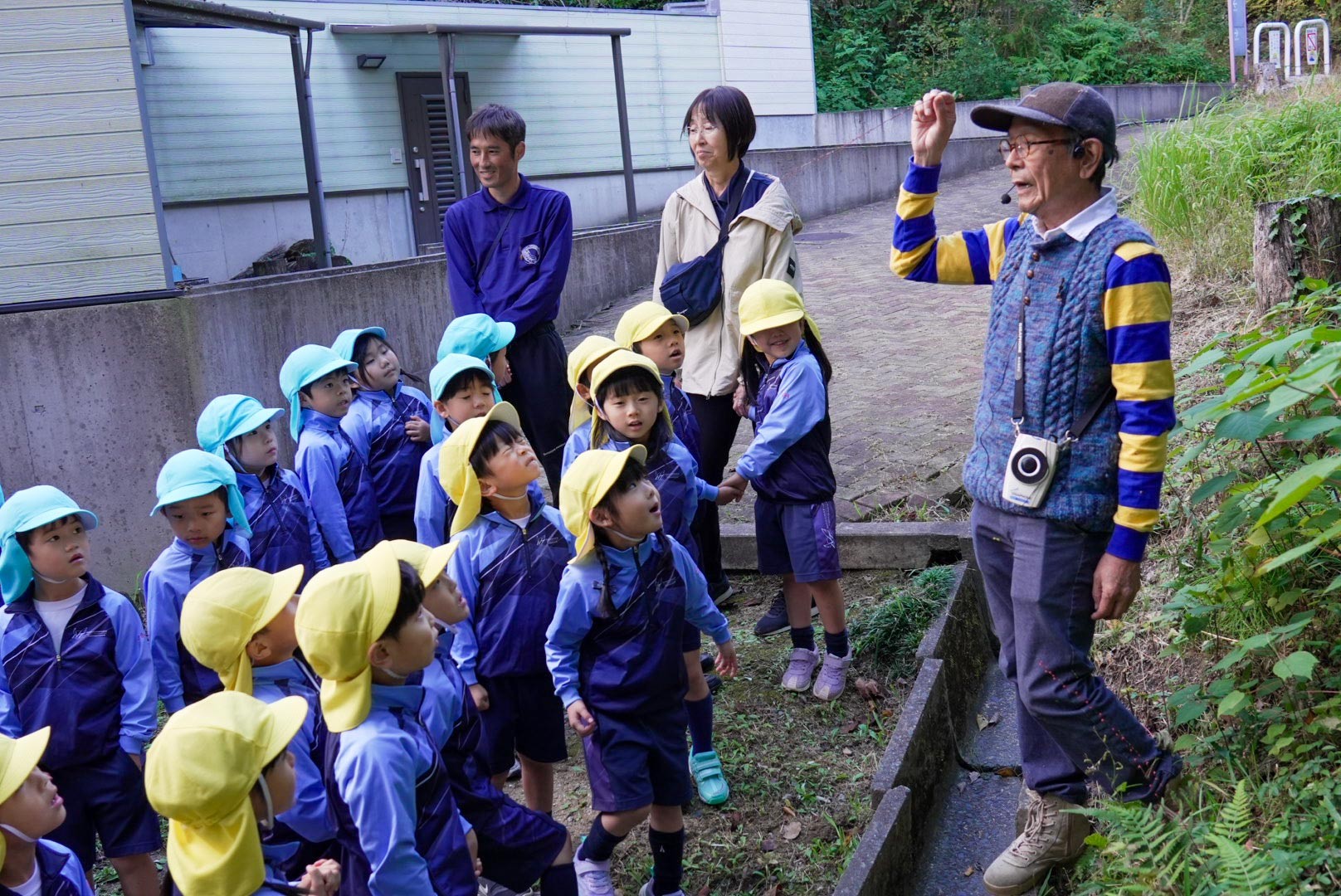 「今日は何の話だと思う?」と久保先生。くるっと後ろを向くと、背中にヒッツキムシが!オオオナモミのヒッツキムシをひとつずつもらって遊んだあとは、森へガイドウォークに出かけました。