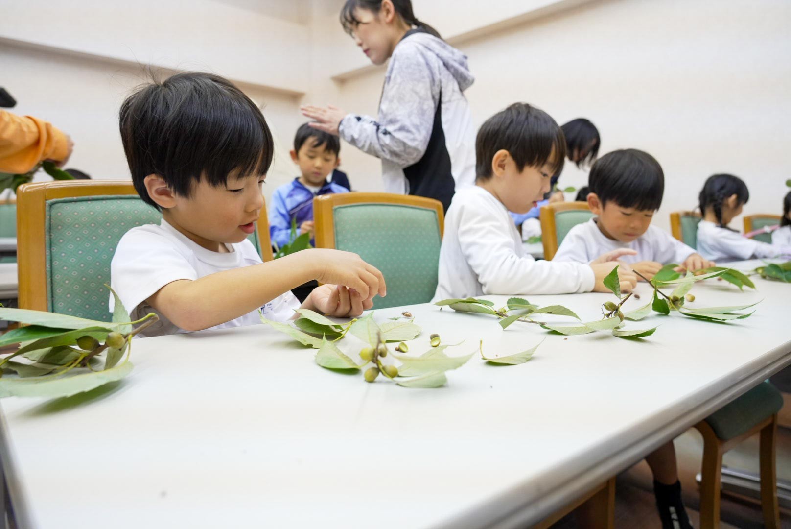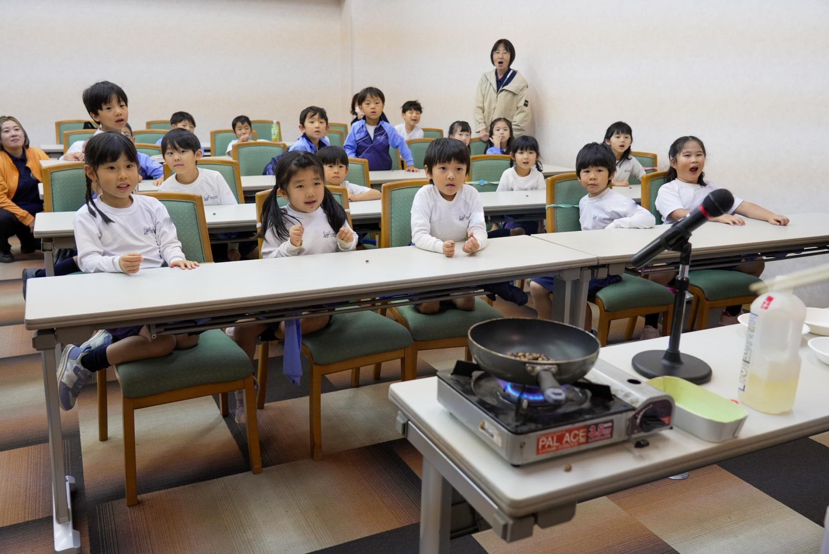ガイドウォークのあとは、ホールで入所式を行い、そのあと久保先生がどんぐりをごちそうしてくれました!スダジイとマテバシイのどんぐりは、フライパンで熱するとポップコーンみたいにポンポン弾けてみんな驚きました。食べると「おいしい」「もっと食べたい」などと、はじめての味に感動していました。