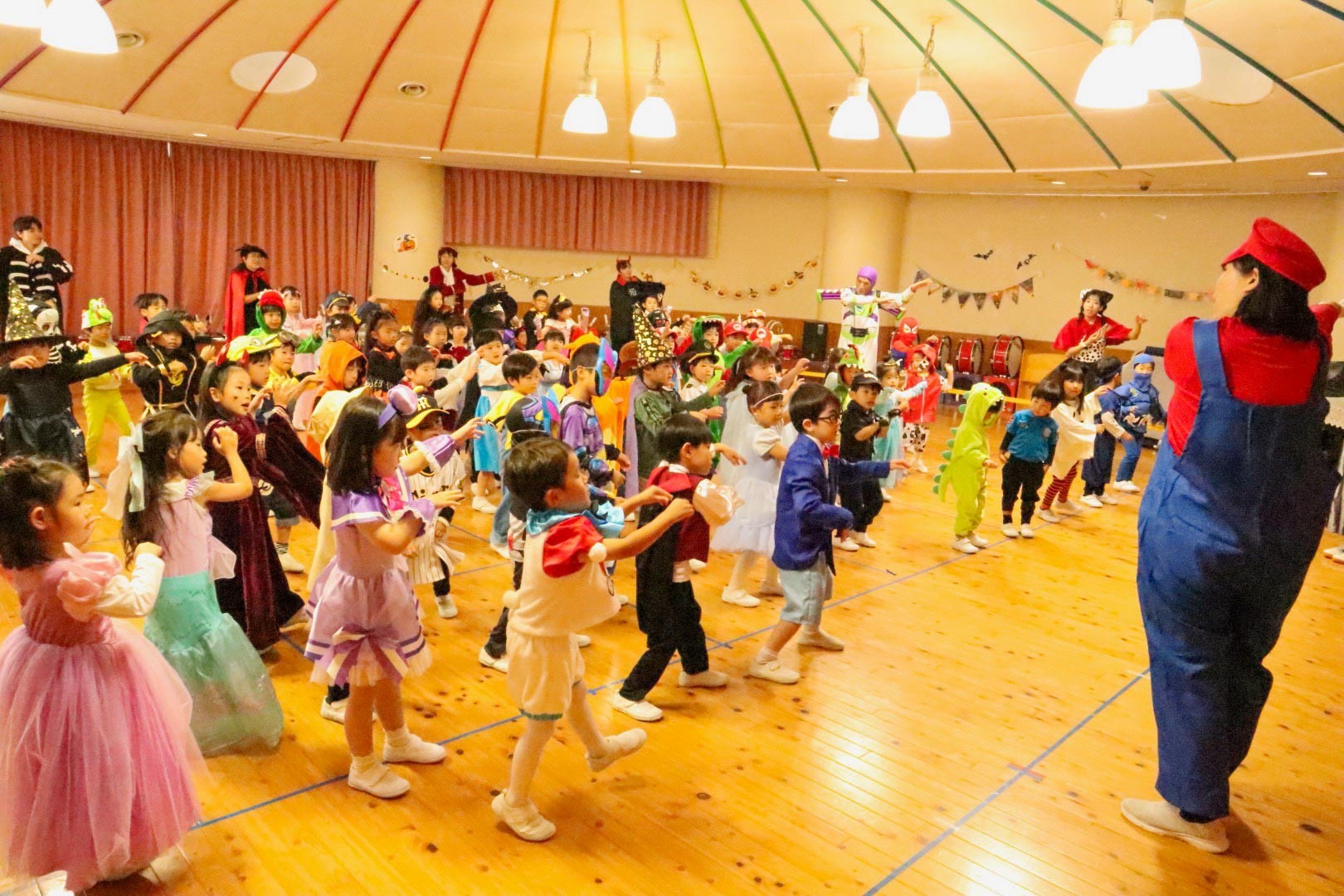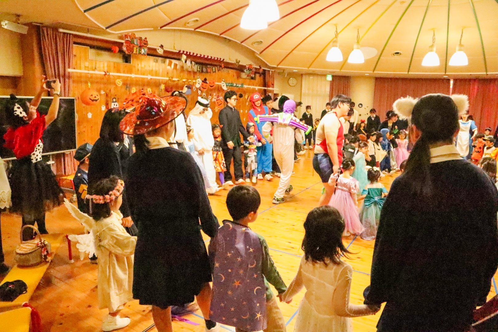 パーティが盛り上がっているところに、Y2(高校1年)生の生徒たちが仮装して遊戯室にきてくれました。高校生たちは園児たちと手をつなぎ、一緒にリズムをとりながら楽しくステップを踏んでいました。会場は笑顔と歌声であふれ、学齢を超えた楽しいひとときをすごしました。