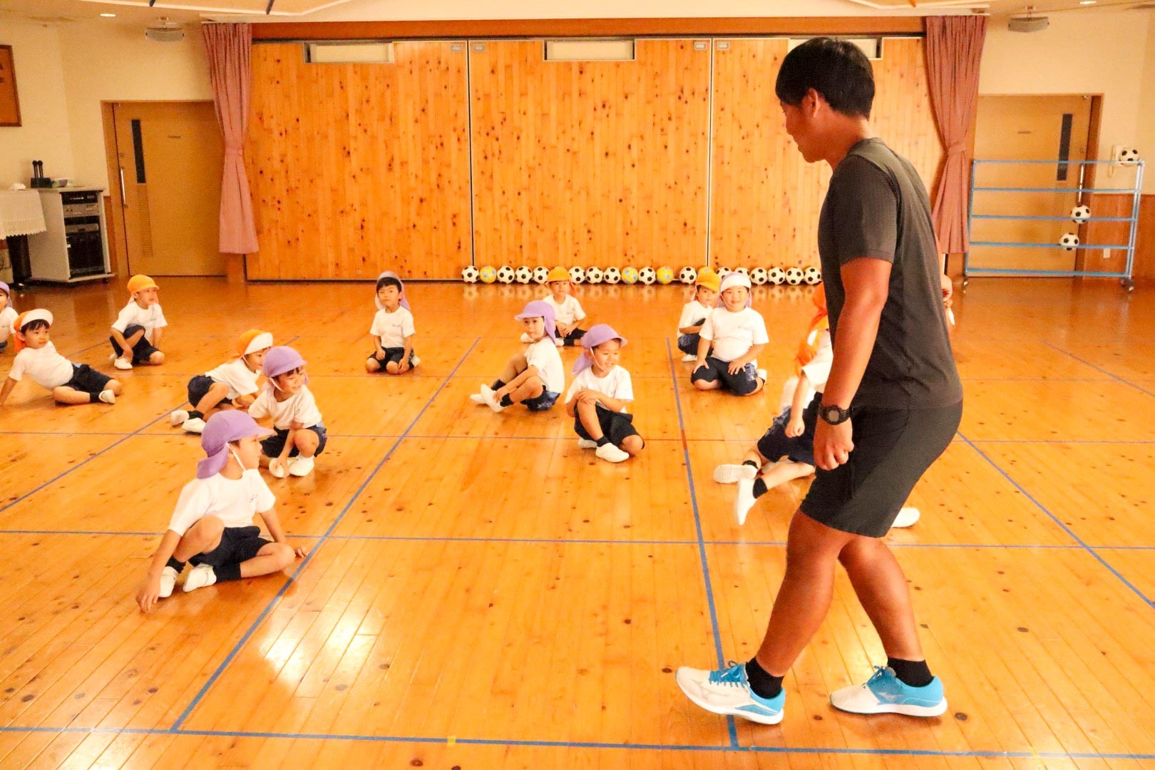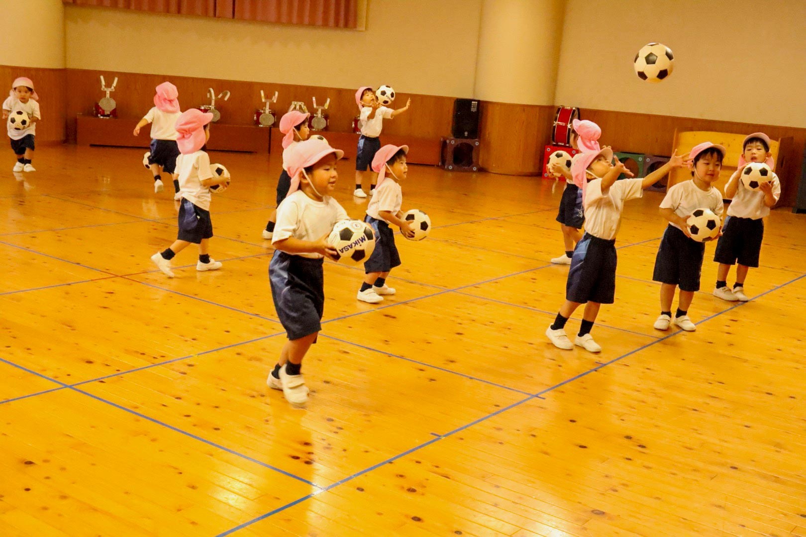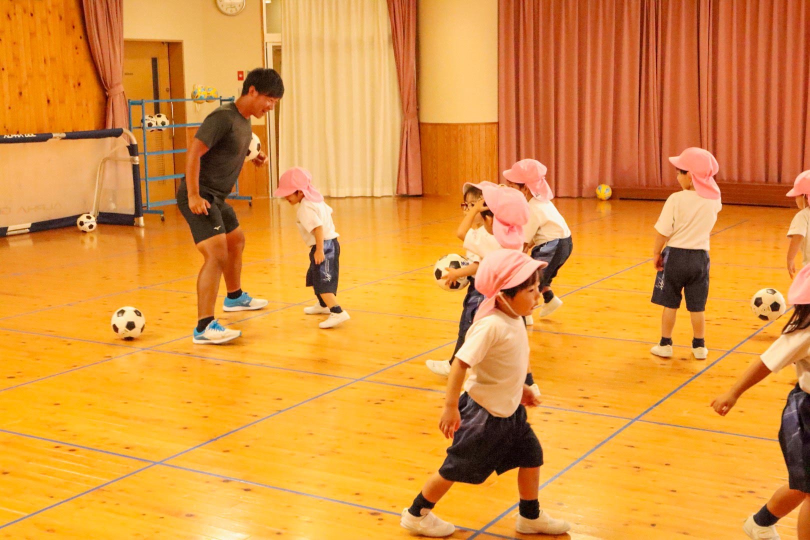 年少組では、先生が転がしたサッカーボールに触れないように逃げるゲームをしました。つづいて園児たちが先生にサッカーボールを当てるゲームをしました。ボールをうまく避けて逃げる先生を追いかけて、遊戯室いっぱいに走り回りました。もっとサッカーボールに慣れるため、上に座ったり、上下に投げてキャッチしたり、両足を交互にサッカーボールに触れたりする練習をしました。