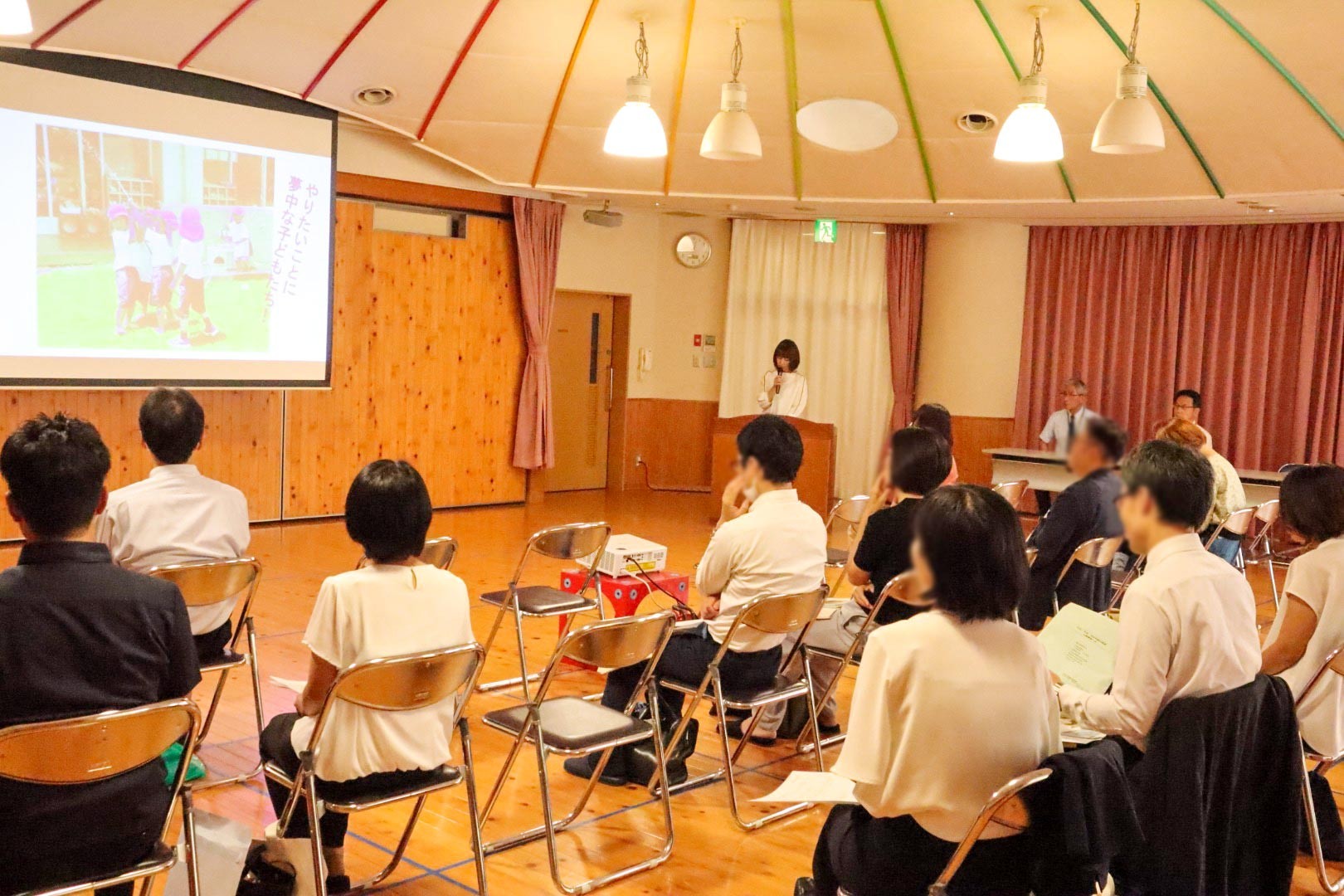 続いて益田主任から、本園の教育内容や園生活、年間行事など、具体的な取り組みを紹介しました。