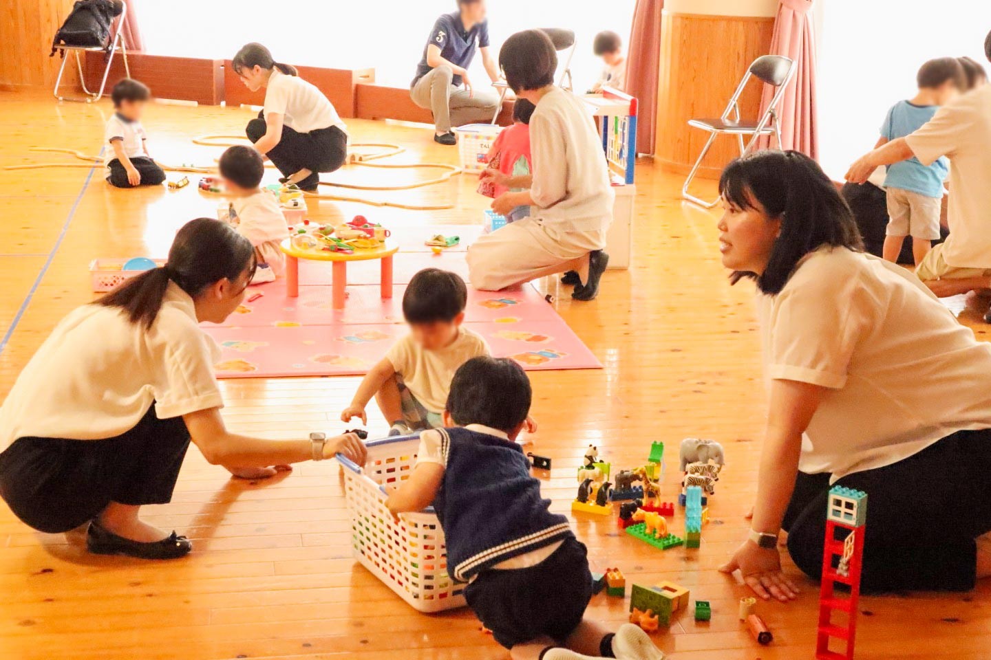 説明会の間、遊戯室の後方に設けられたスペースで、保護者の皆様と一緒に来園した子どもたちが、先生と絵本やおもちゃで楽しく遊んでいました。