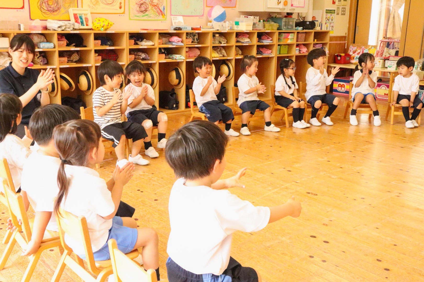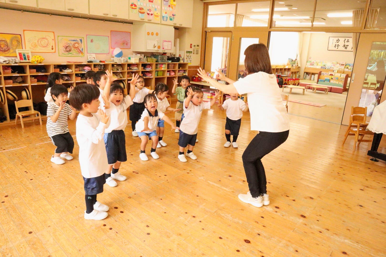 朝のごあいさつにはじまり、歌や歌ったり保育室をいっぱいに使ってリズム体操をしたりして遊びました。
