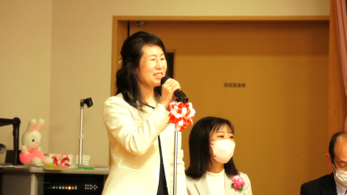担任の先生を紹介の後は、奈良学園幼稚園 年長組40名による歓迎です。手作りのチューリップで会場を満開にして、さらに「パンダうさぎコアラ」でお馴染の動物たちもお出迎え! みんなの笑顔に包まれた、陽気な春の宴となりました。