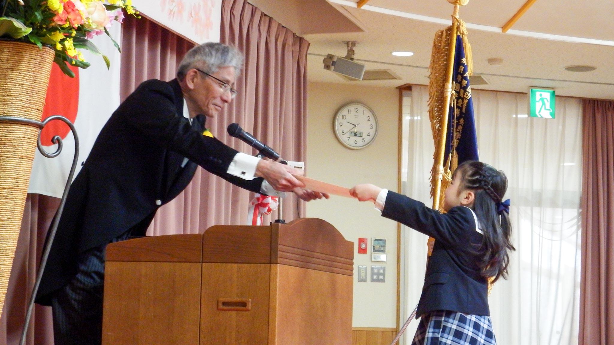 式が始まると年長組34人の子どもたちが、堂々と胸を張って会場に入場してきました。みんなで園歌を歌った後、「おめでとう」という言葉とともに、槇園長から一人ひとりに修了証書が手渡されました。証書を受け取った子どもたちは、「おいしいご飯ありがとう」「いつもかわいい髪型ありがとう」「大好きだよ」などと、お母さんやお父さんに自分の言葉で感謝を伝え、証書を渡しました。