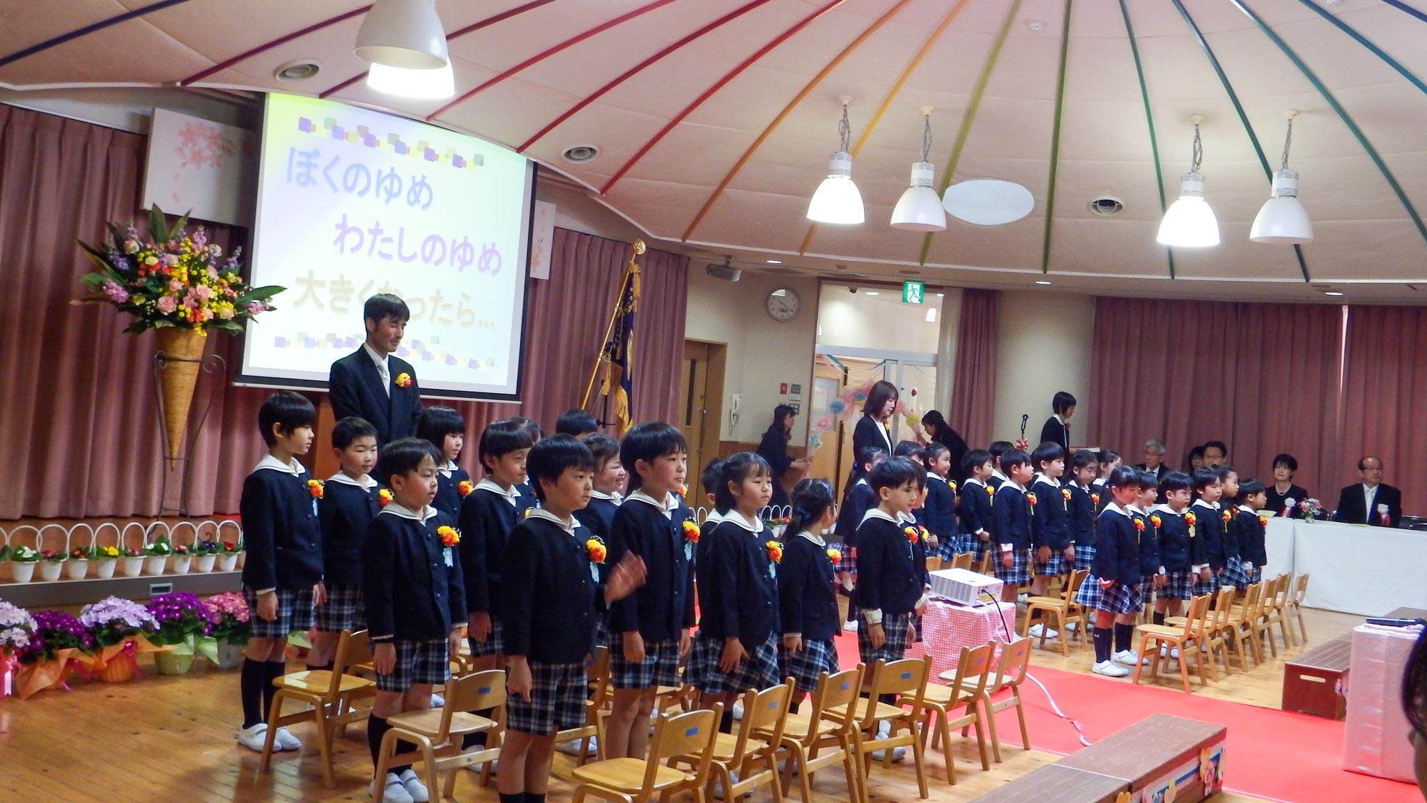 その後、卒園児みんなで「友〜旅立ちの時〜」を歌いました。楽しかった幼稚園での日々を惜しんで涙ぐむ子どもたちもいました。