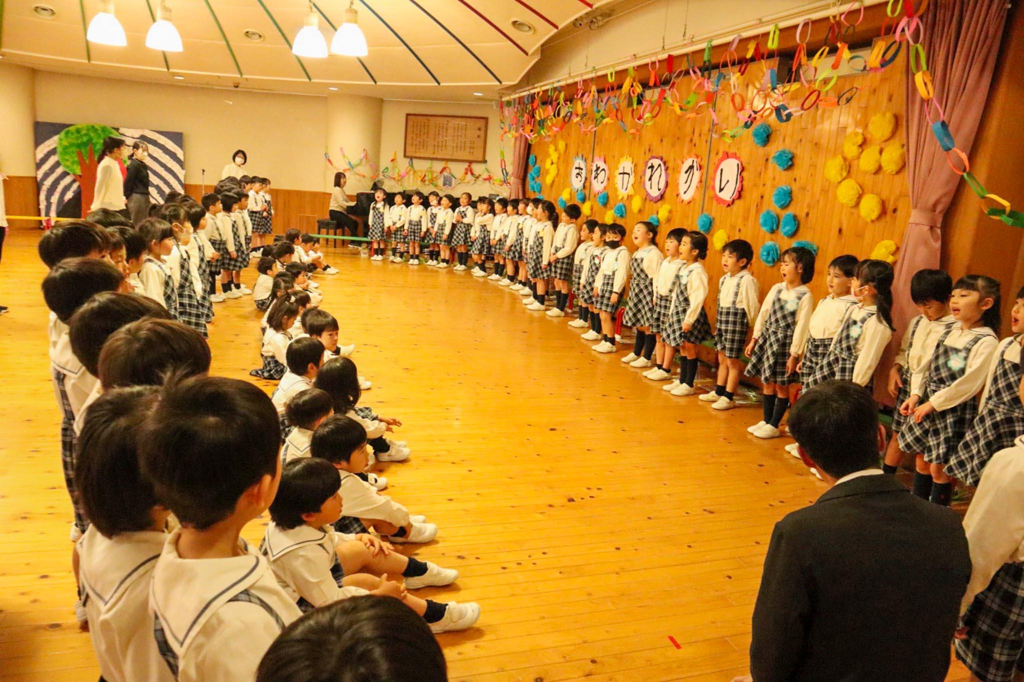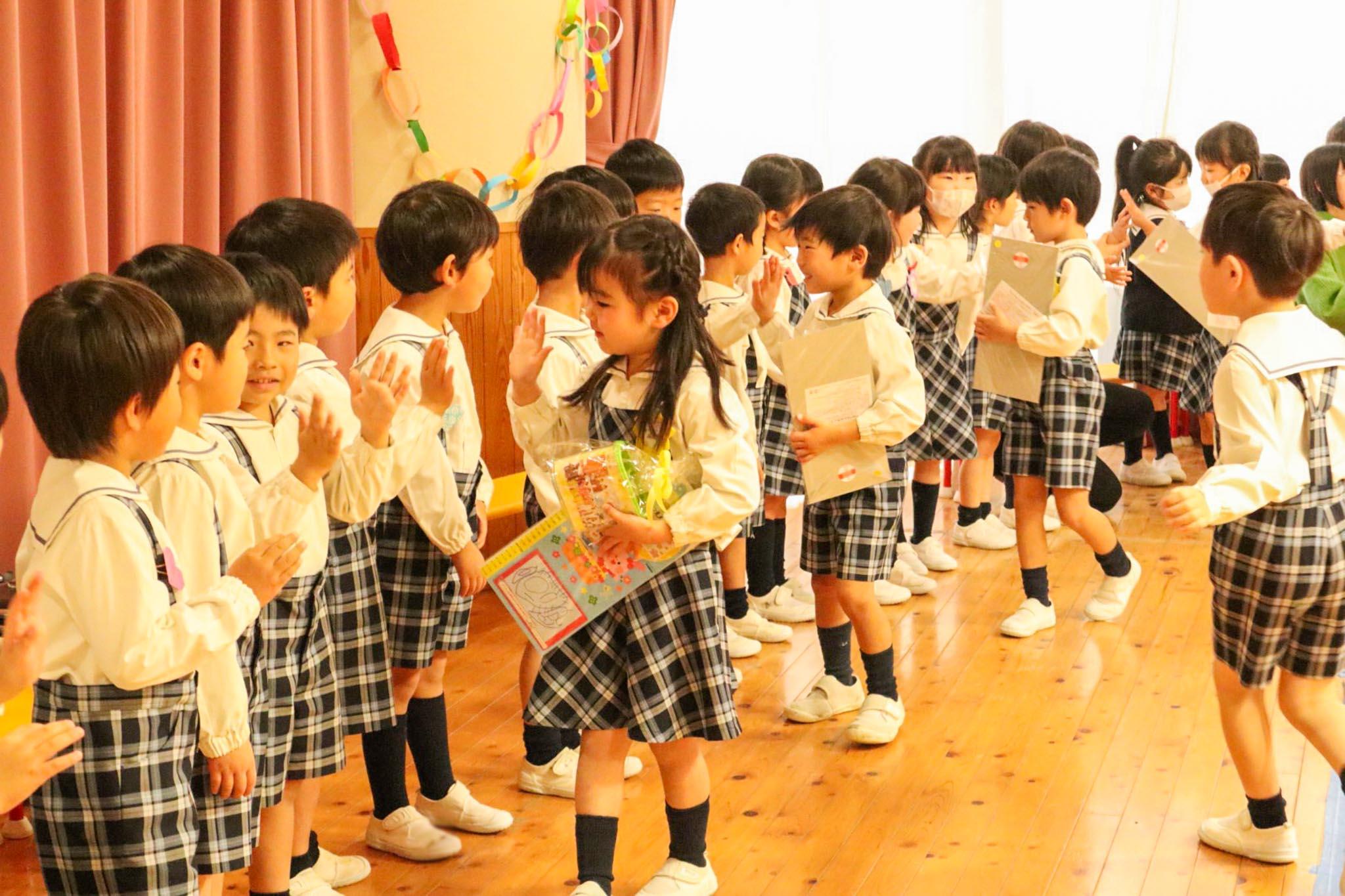 続いて年中児、年少児からそれぞれ「お兄さん、お姉さん、いつも一緒に遊んでくれてありがとう。また幼稚園に遊びに来てね」の言葉と歌を贈りました。年長組の一人一人にプレゼントを手渡しました。