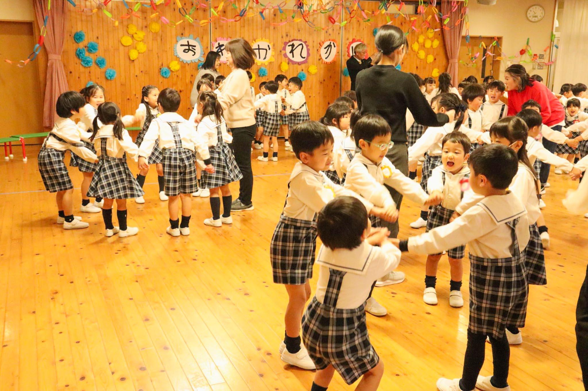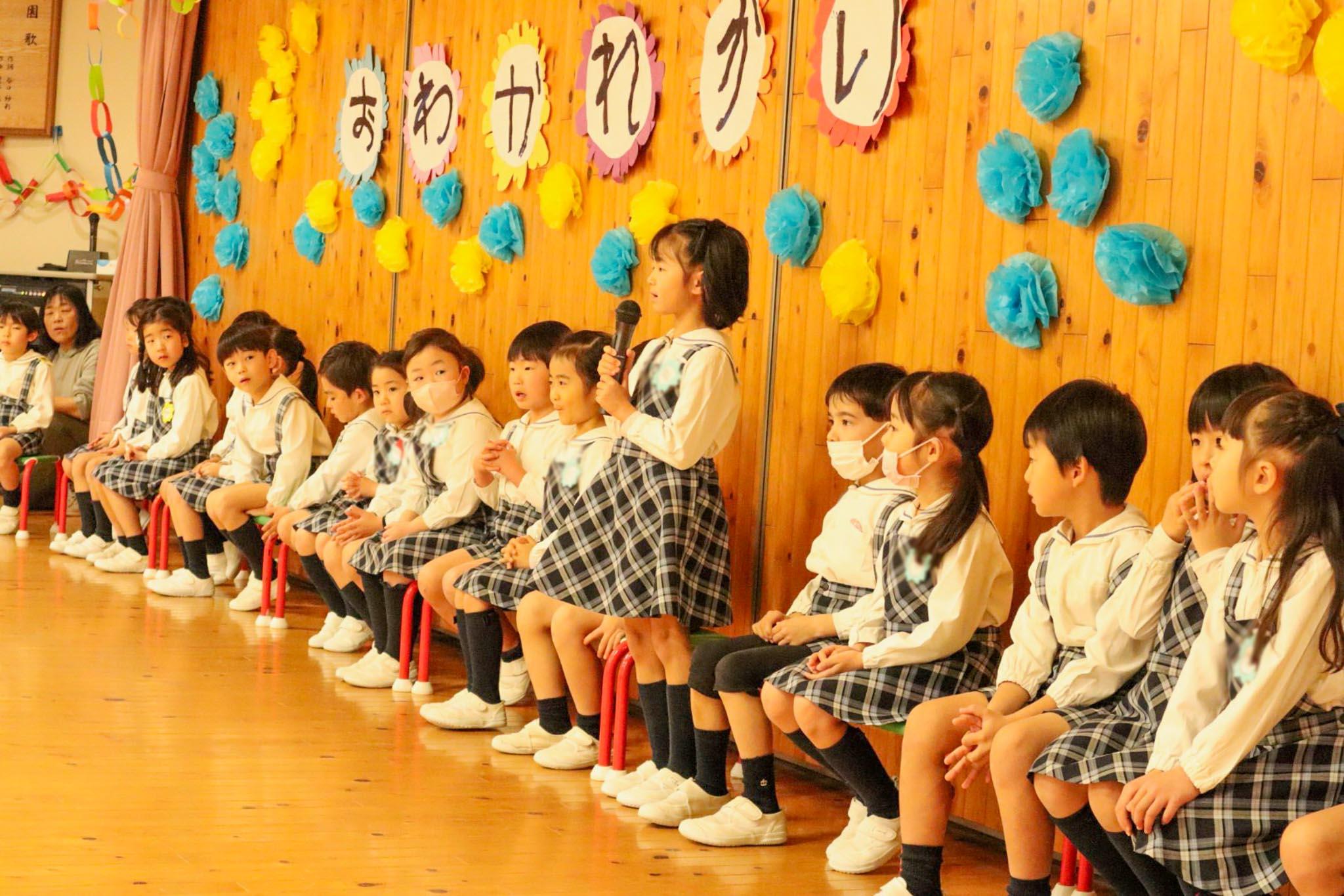 まずは年長児の一人一人がマイクを手に持って、名前と4月から入学する小学校名を教えてくれました。あいさつがおわると、みんなで遊戯室をいっぱい使い思い出をテーマにリズム遊びをしました。