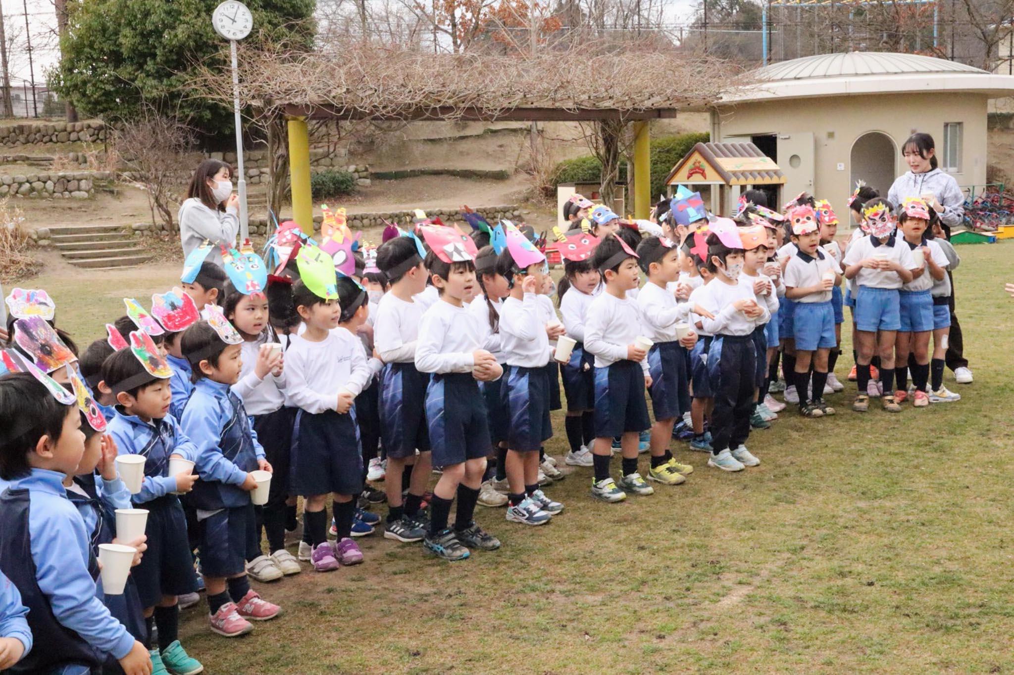 手作りの鬼のお面をかぶり、かわいい鬼たちが園庭に集まりました。先生から「みんなの心の中にも鬼がすんでいるかもしれませんよ。弱虫鬼や泣き虫鬼、お友だちに意地悪する鬼、ちゃんとお片付けをしない鬼とかいるんじゃないかな。今日はそんな鬼も豆まきをしてやっつけちゃいましょう」とお話しがありました。