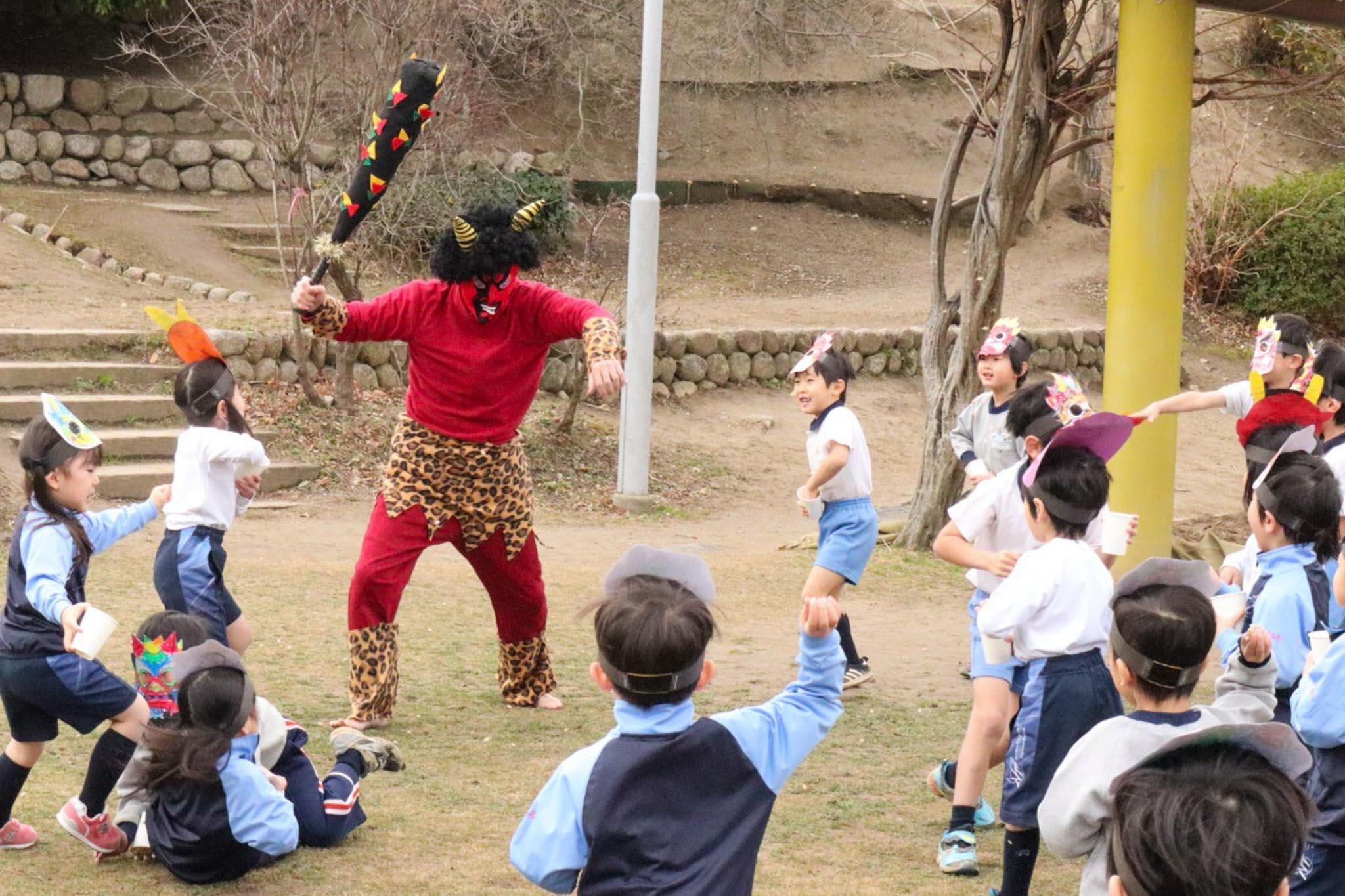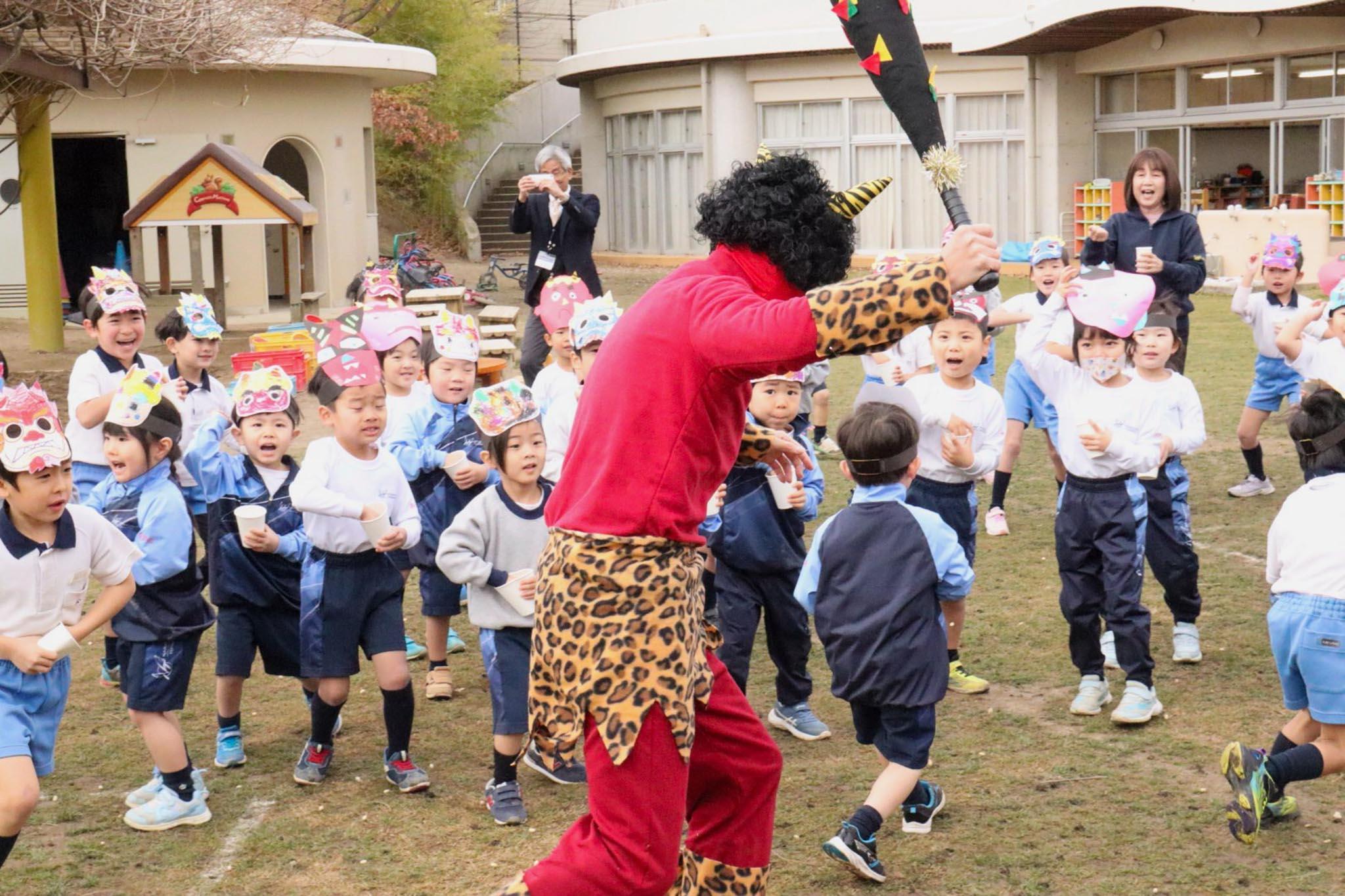 園児は「鬼をやっつけるぞ〜!えいえいおー!」と力強く叫んでいました。すると園庭に、赤鬼がやってきました。園児たちは、「鬼は〜外!」と元気な歓声をあげながら豆をまきました。