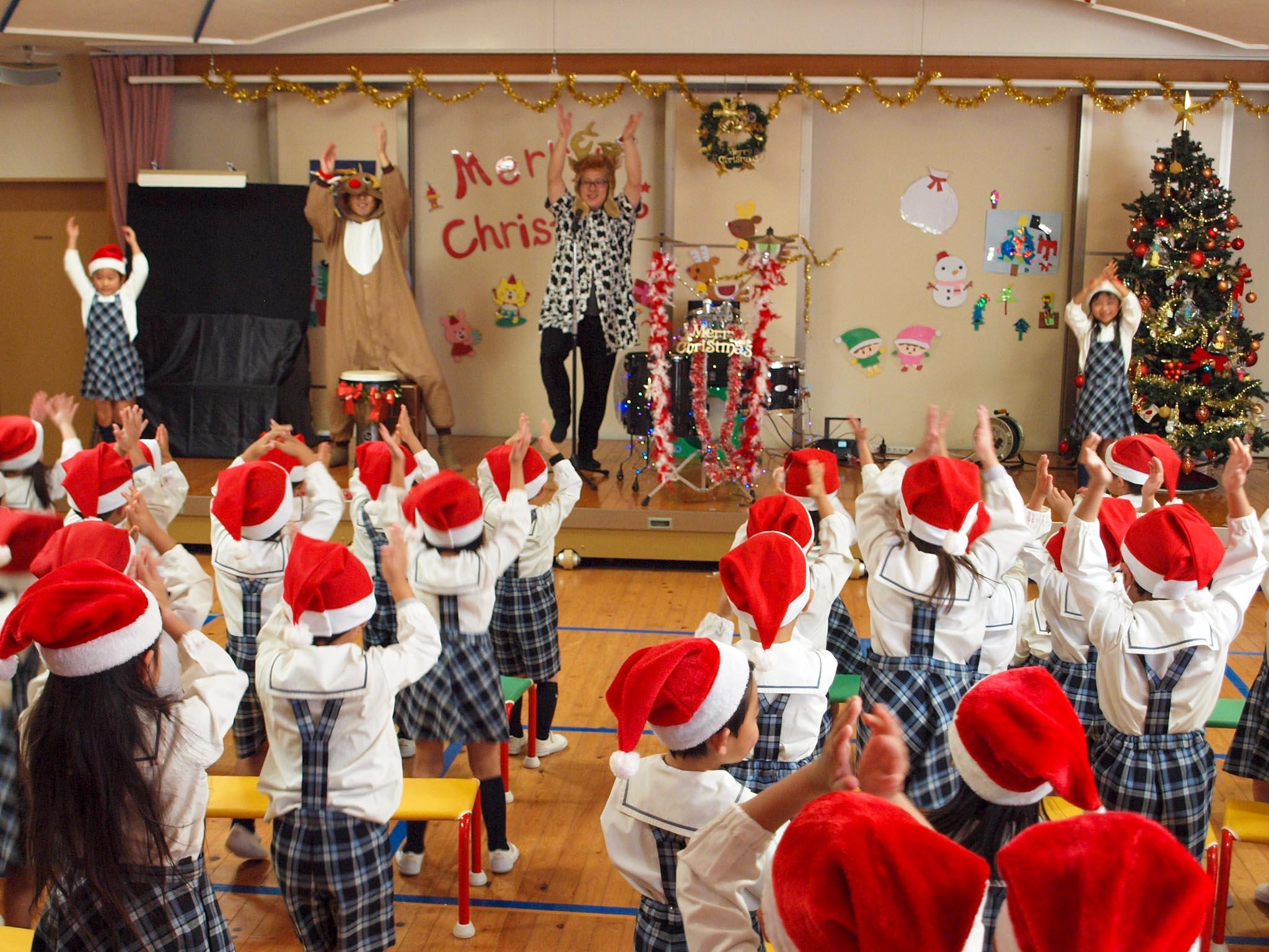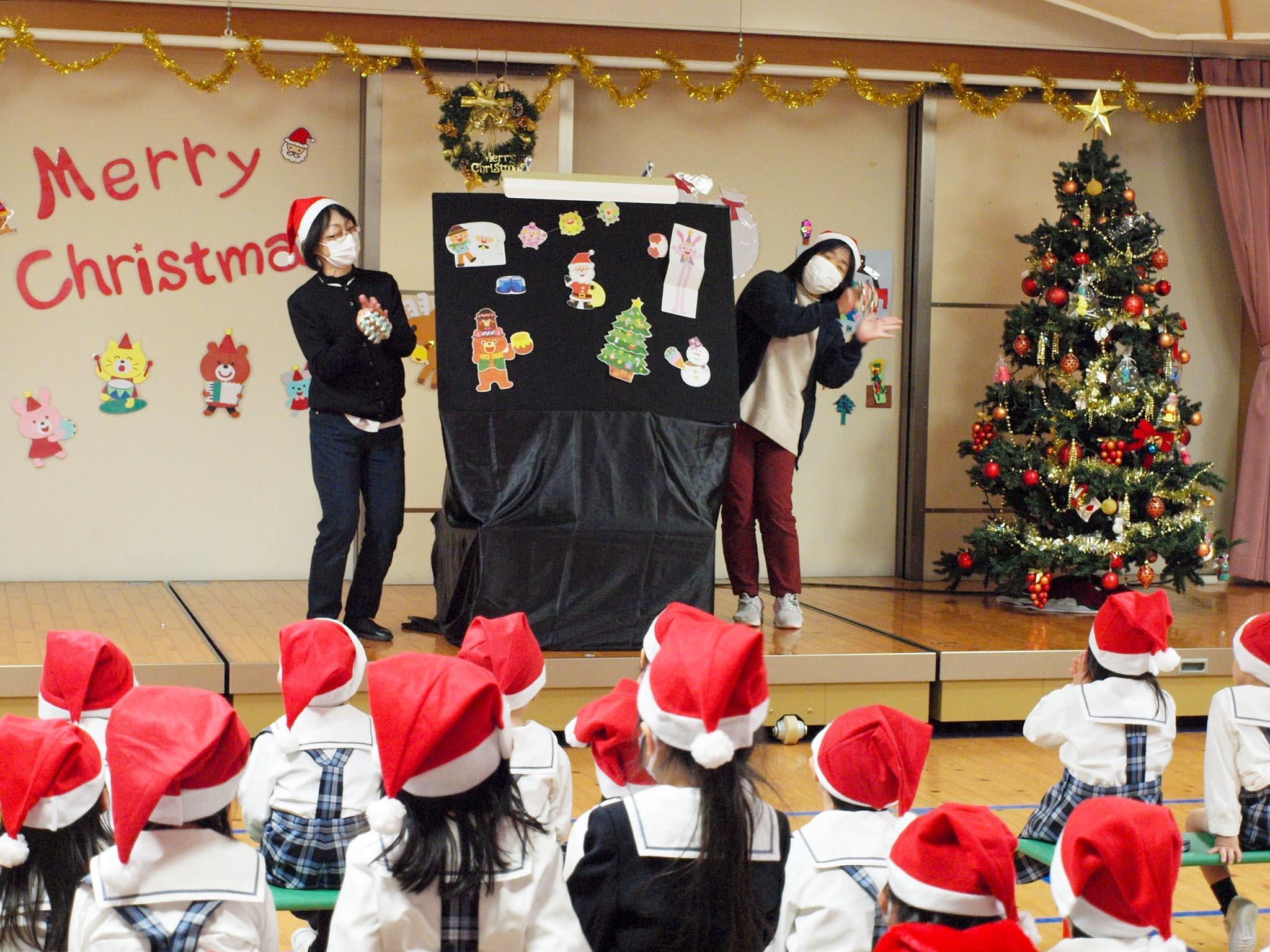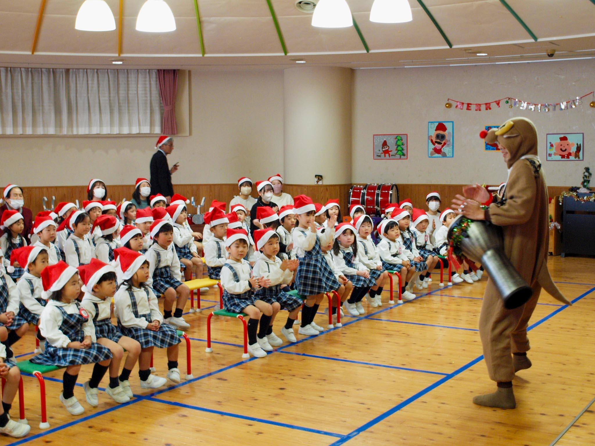 12月21日(木)、大きなクリスマスツリーの飾られた遊戯室に、サンタ帽をかぶった園児たちが集まり、クリスマス会が始まりました。