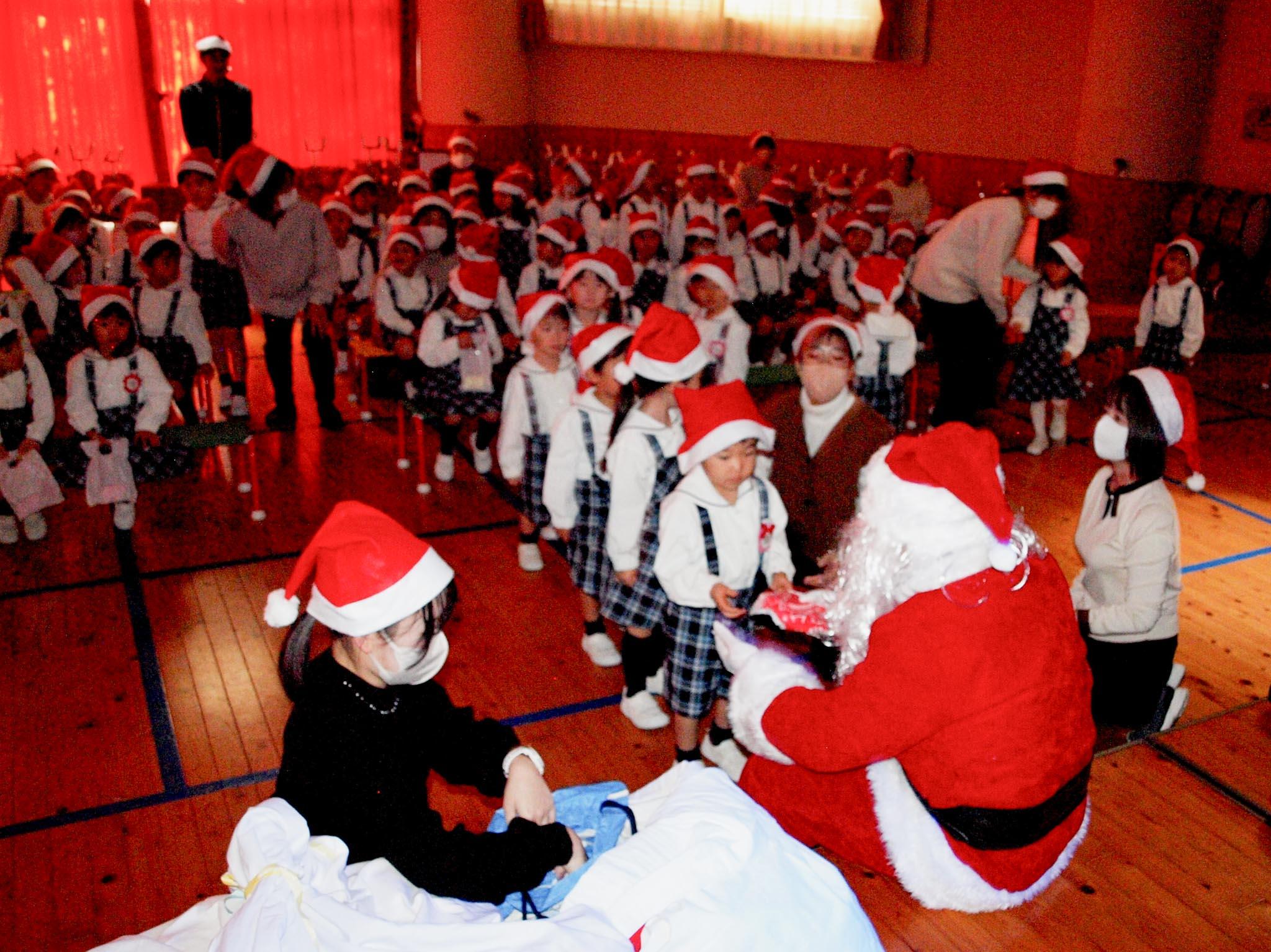第二部は、鈴の音とともに槇園長が英語のクリスマス・ソングを歌い、先生たちがパネルシアターを見せてくれました。静かな雰囲気の中、会場のあかりが消えると、大きな袋を持ったサンタさんが「Merry Christmas!」と言いながら現れると、みんなびっくり。サンタさんは園児ひとりひとりに、プレゼントを手渡してくれました。園児たちは手を振りながら「サンタさん!ありがとう!また来年も来てね」と見送りました。