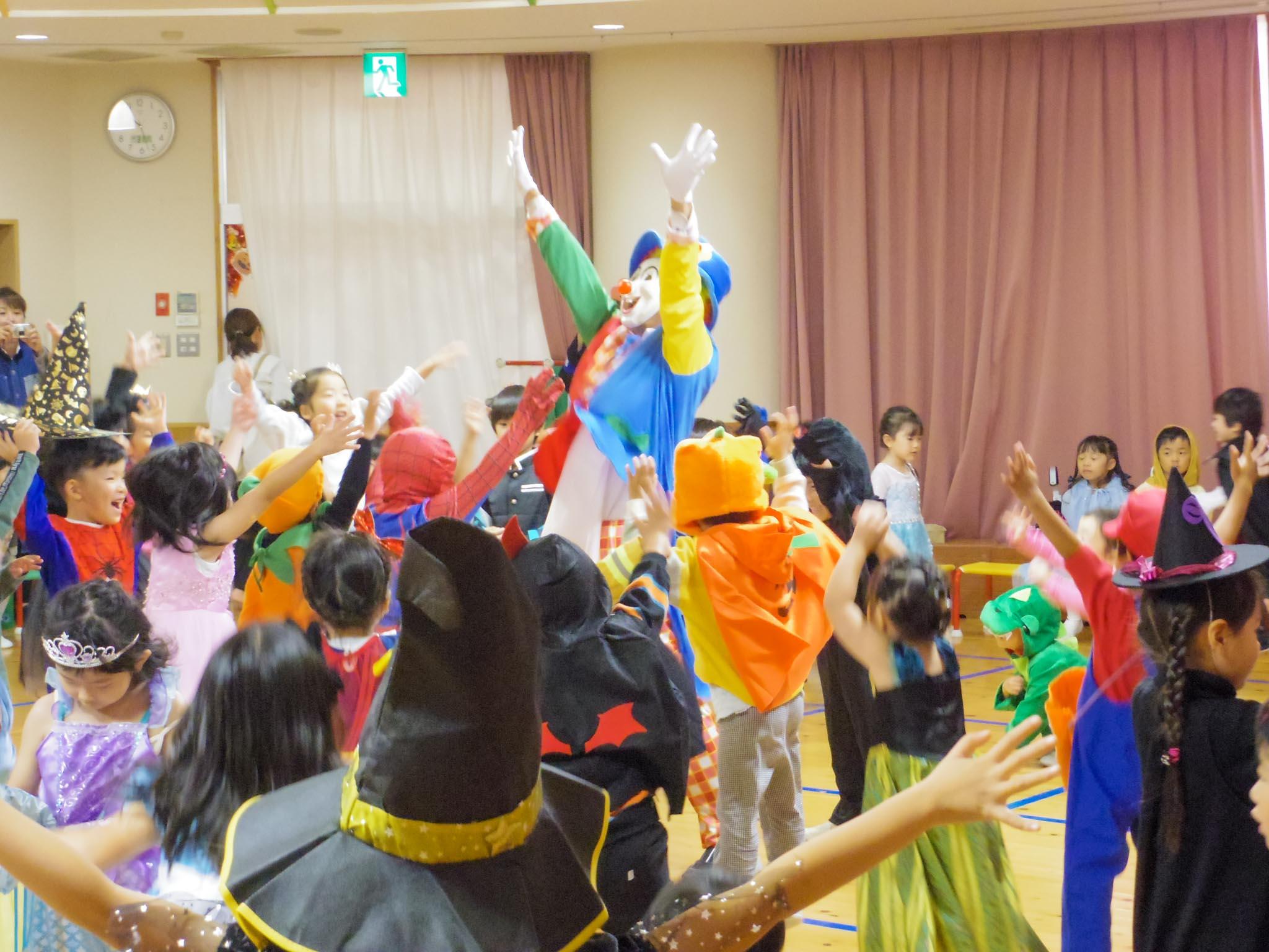 10月31日(火)、ハロウィンパーティーを行いました。朝、ハロウィンの飾りつけで様変わりした幼稚園に、仮装をした園児たちが登園してきました。