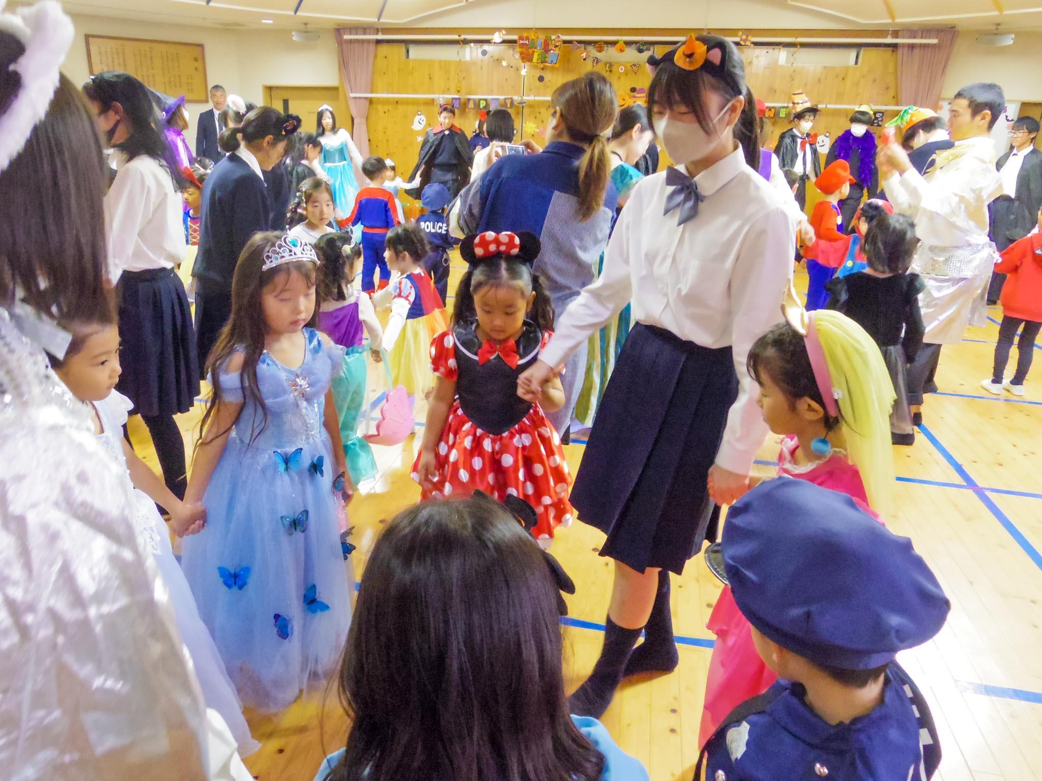 遊戯室に集まり、手遊びやダンス、◯✕クイズを楽しみ、先生がパネルシアター「おばけマンション」を上演してくれました。すると、素敵なゲストが遊びにきてくれました。仮装をしたY2(高校1年)生のみなさんです。「今夜はハロウィンナイト」のダンスを披露したあと、園児たちも輪に入って一緒に踊りました。