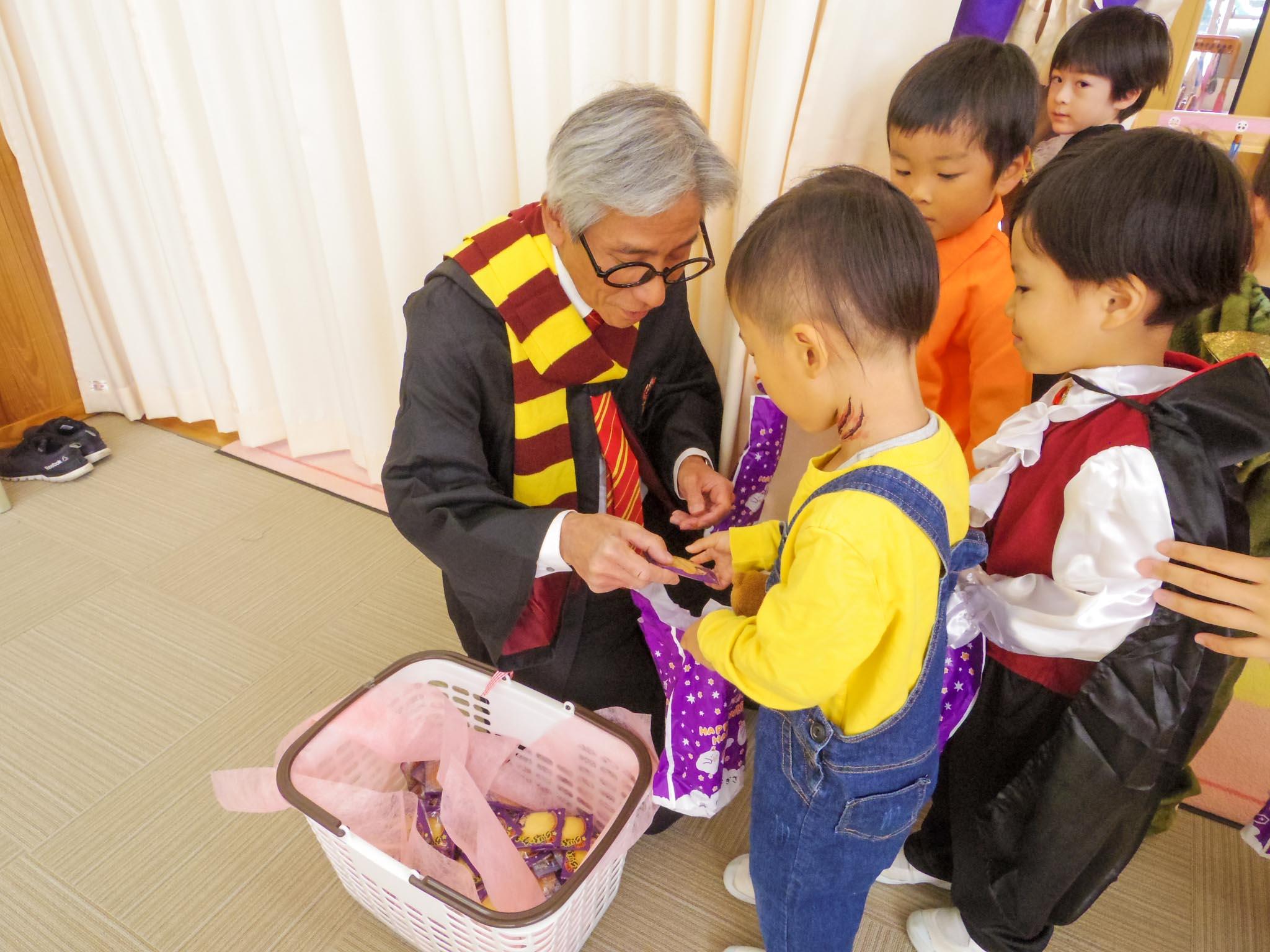 「トリックオアトリート!」園内に隠れた先生たちを探しておやつをもらいに行きました。その後もハロウィンの特別給食やお話の会など、楽しいハロウィンパーティーの一日となりました。