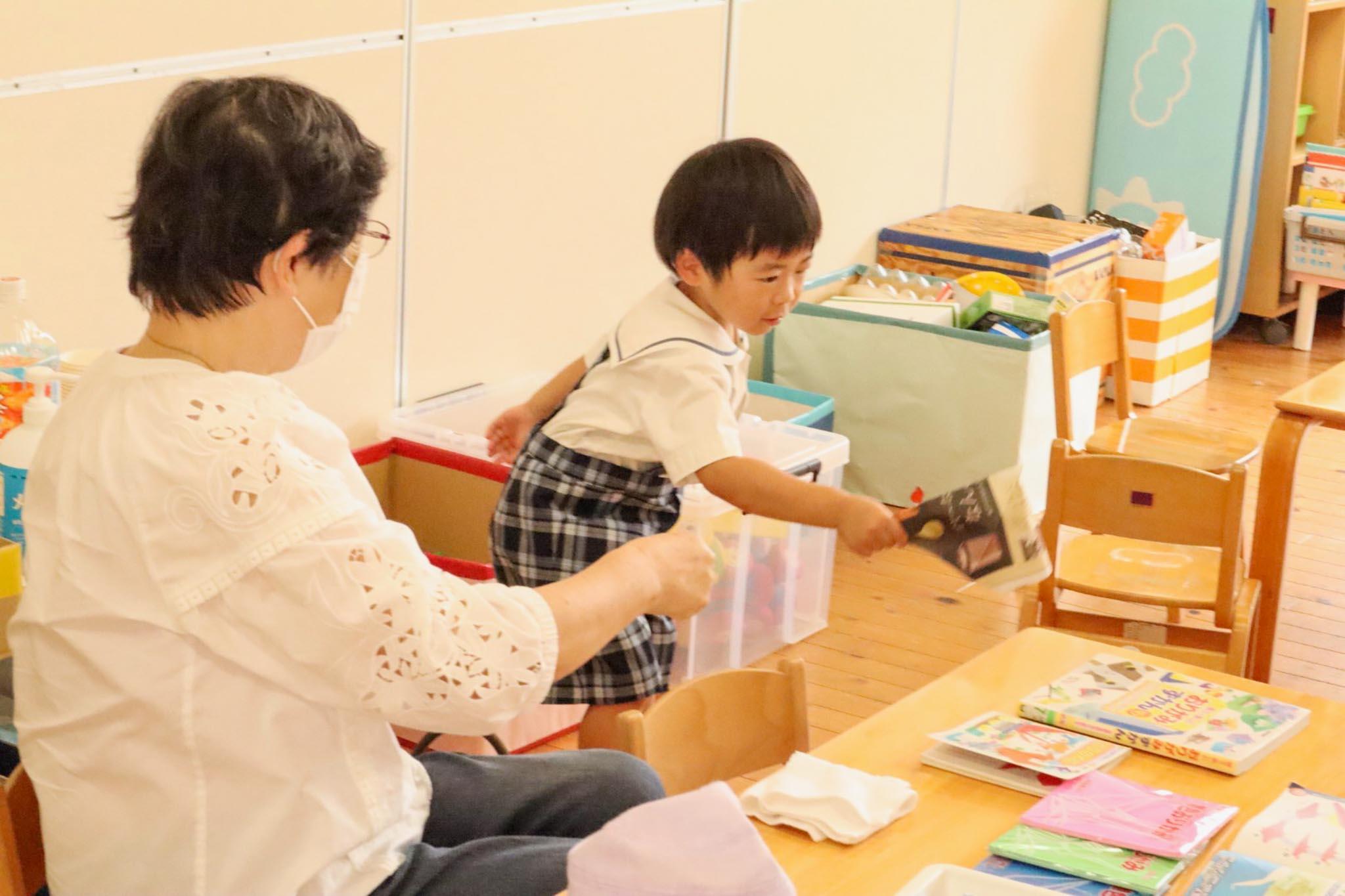 各保育室に色々なゲームコーナーを設け、けん玉やコマの回し方、お手玉を一緒になって遊び方を教えてもらい楽しいひと時を過ごしました。