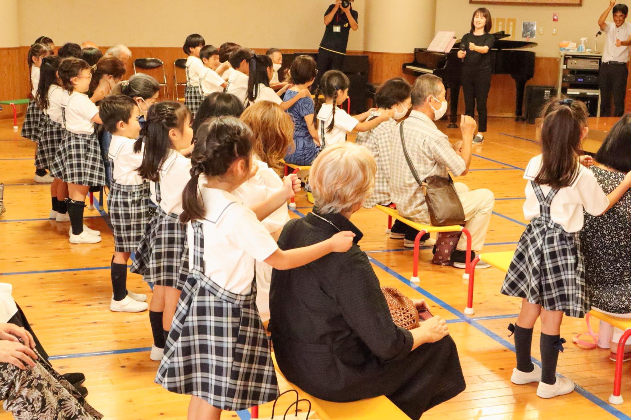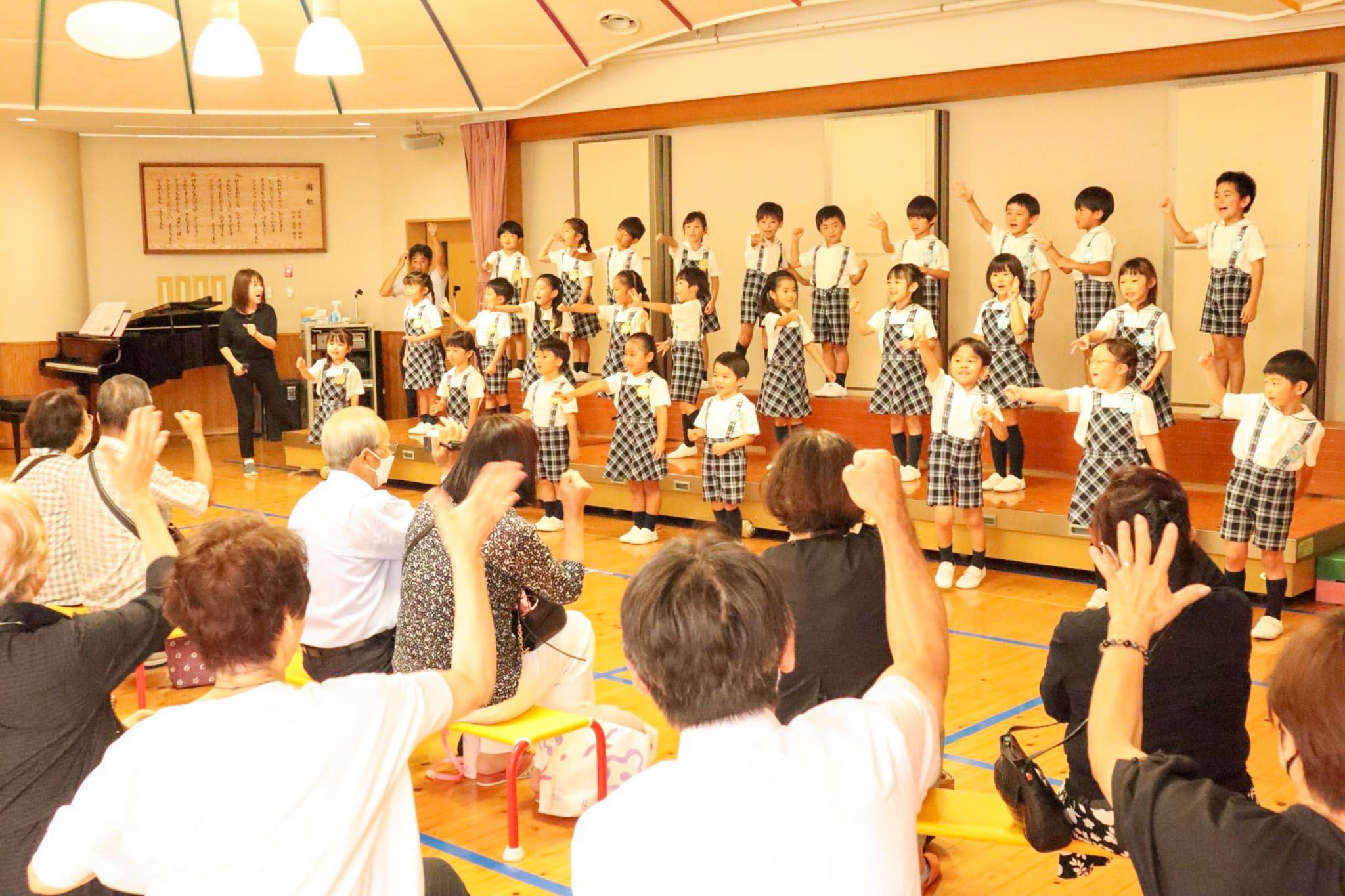 後半は遊戯室に移動し、歌の発表会をしました。まず、園児たちから「おじいちゃんおばあちゃん、いつもやさしくしてくれてありがとう」の感謝のメッセージを伝えました。歌を披露したあと、おじいちゃんおばあちゃんと一緒に手遊びをして遊びました。