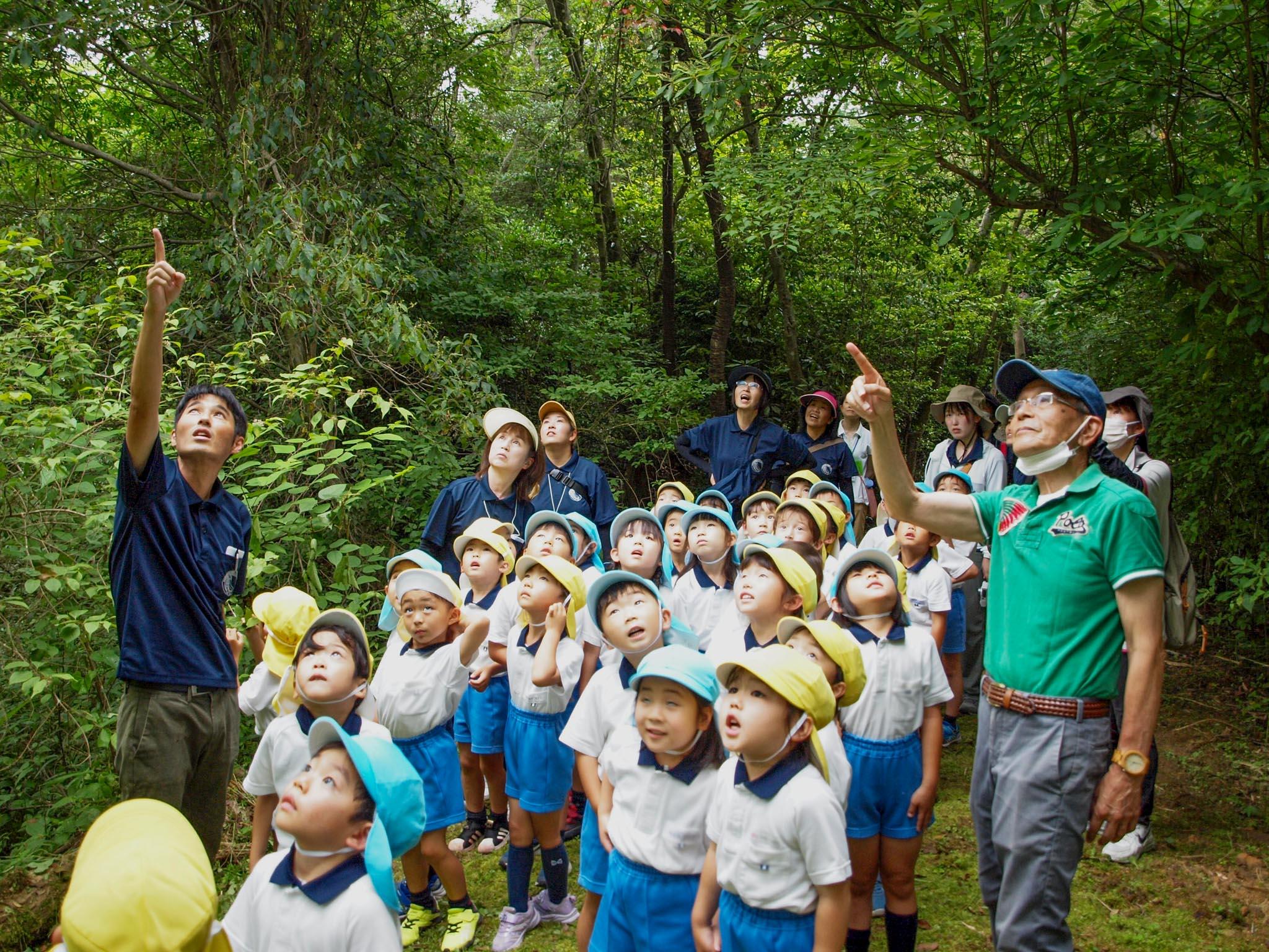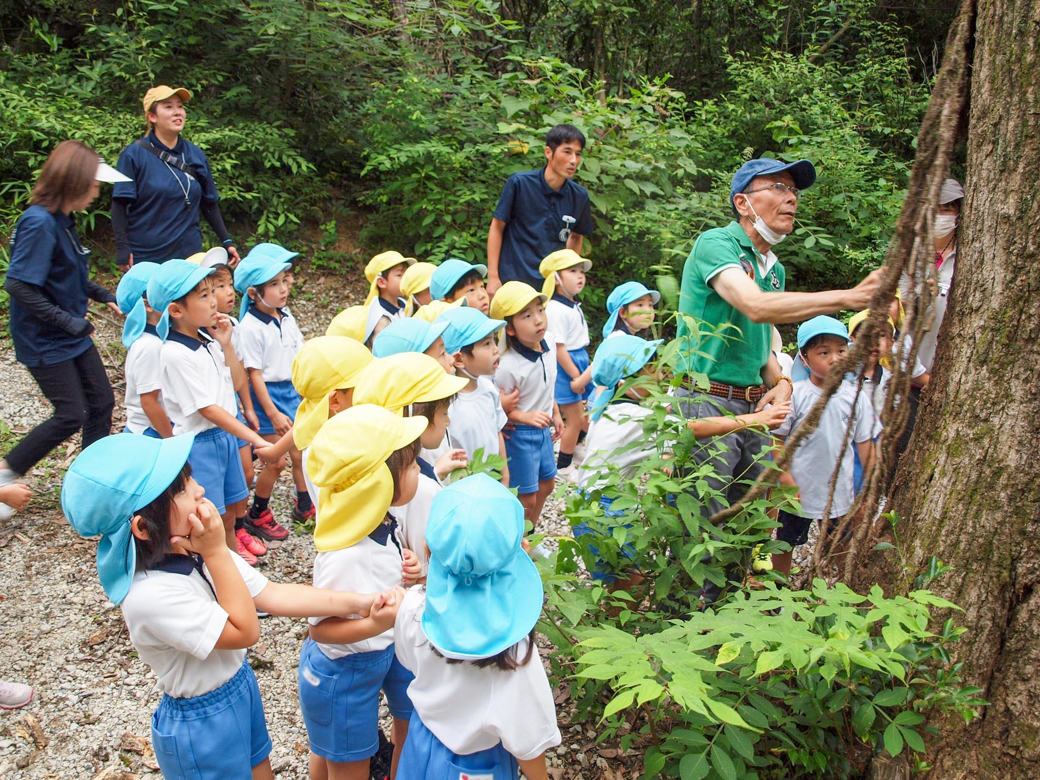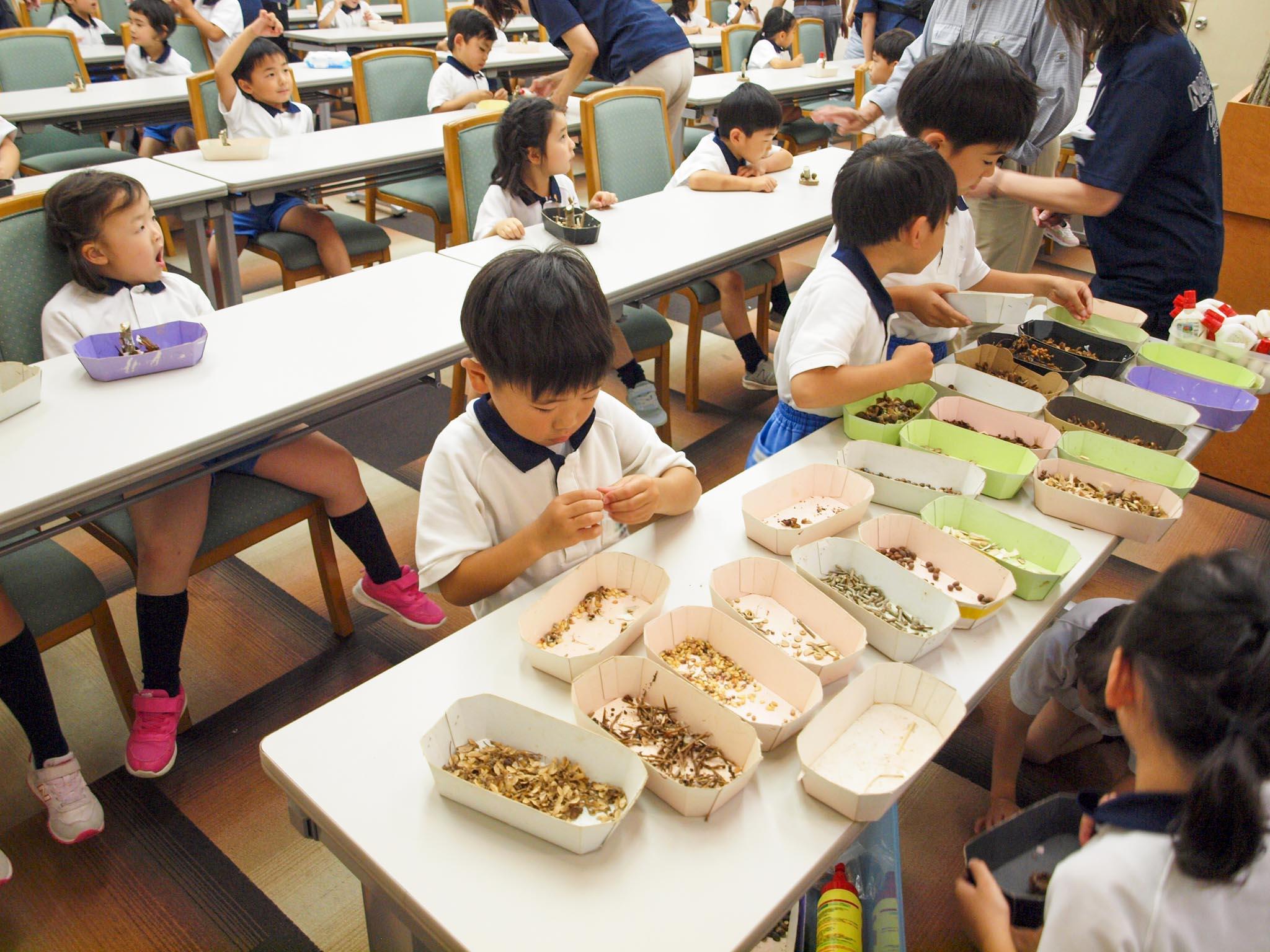 午後に宿泊先のアイアイランドに到着し、ホールで入所式を行った後、NPO法人里山サロンの久保先生の指導の元、木の小枝や木の実などの生駒山麓の自然物を使って、園児達は創造性を発揮してオリジナルのオブジェを作りました。その後は久保先生と森へガイドウォークに出かけます。綿毛がたくさん飛び出す大きな種を飛ばしてもらったり、クワガタがひそんでいる場所を教えてもらったり、ミミズを食べるためにイノシシがほった穴や、モグラがほった穴を教えてもらったり、良い匂いのする植物や実のなる木など、森の自然の中のたくさんのことを教えてもらいました。