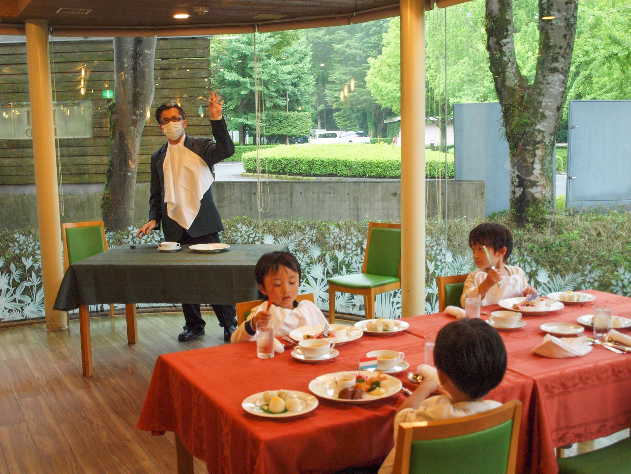 夕食は館内のレストランで、ナイフとフォークを使っていただく本格的なディナーです。最初にレストランの方から、ナプキンやナイフとフォークの使い方、スープの飲み方などのマナーを指導してもらいました。園児達は、自分でナプキンを胸にかけ、教えてもらったようにナイフとフォークを使って、お友達や先生とのディナーを楽しみました。