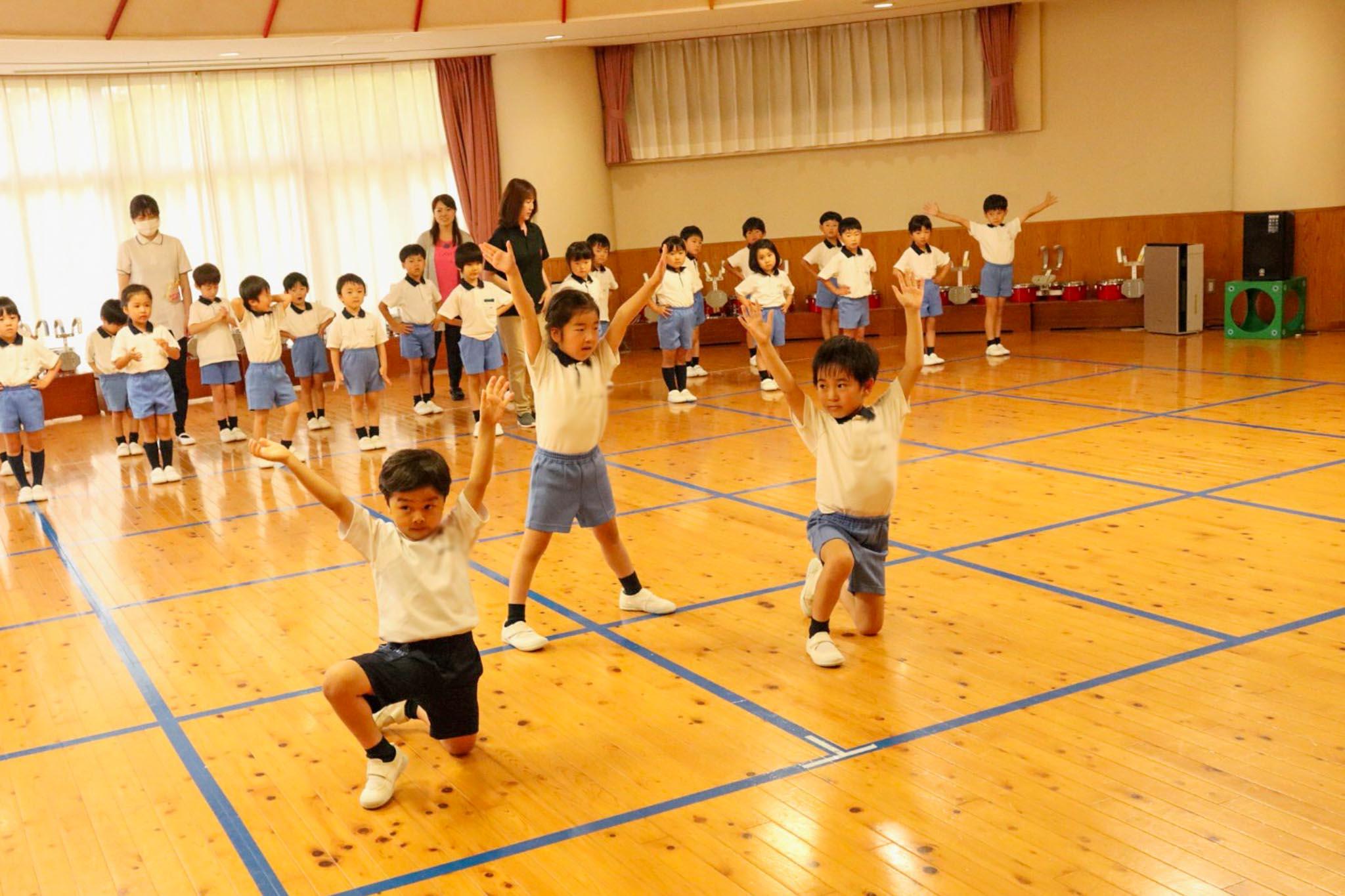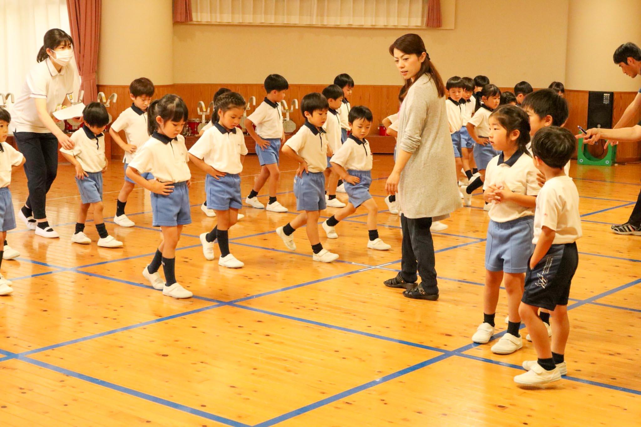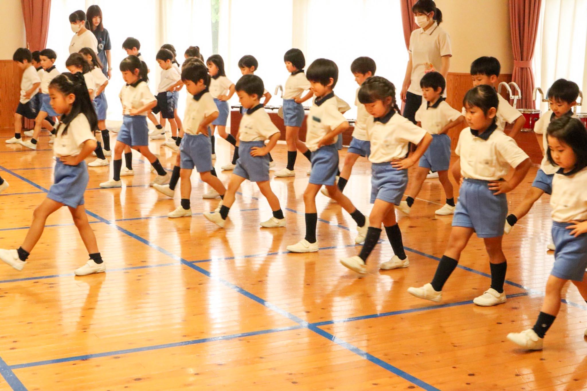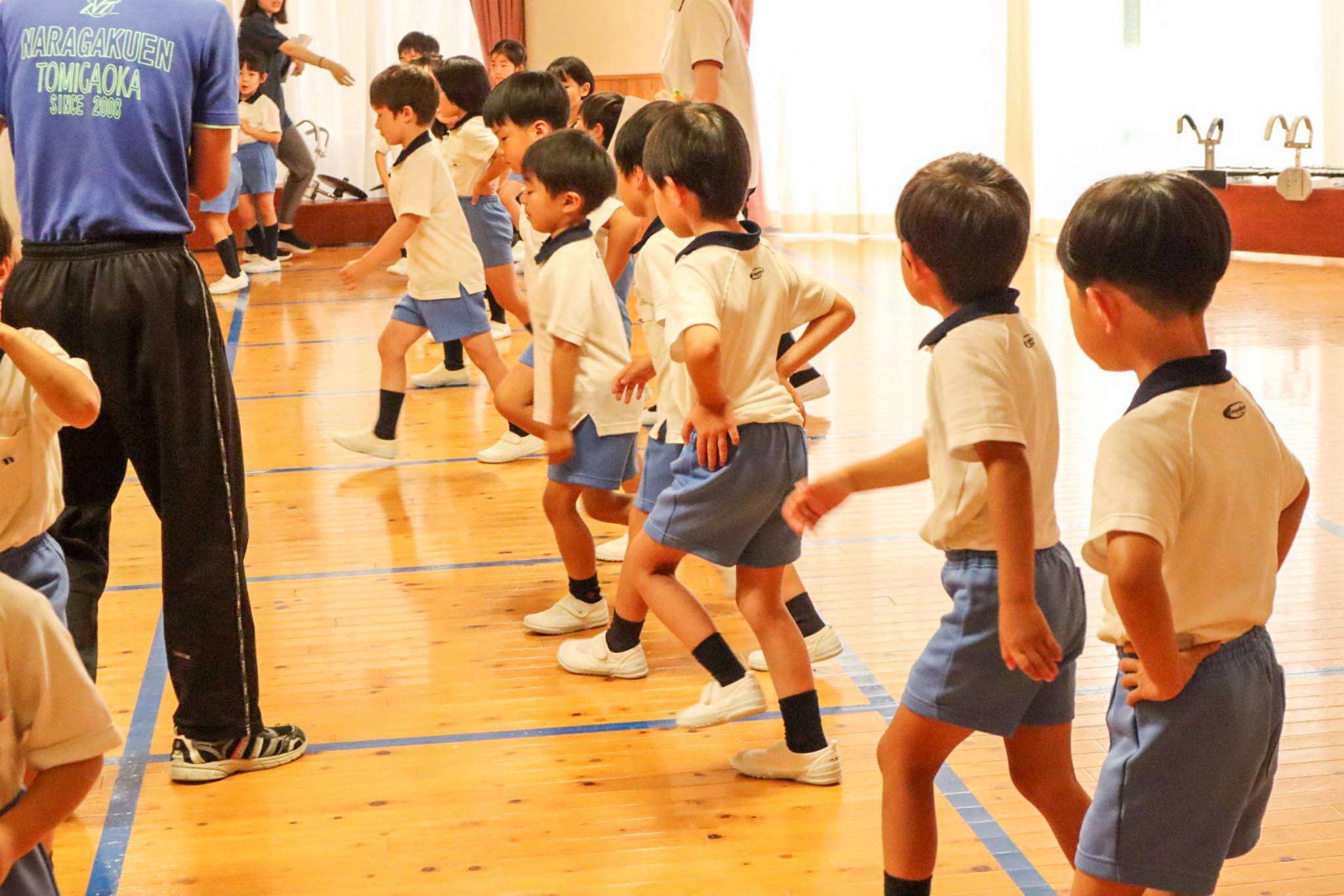 自分の動きだけではなく、右や左、さらには後ろのお友だちの位置や距離を確認しながら、立ち位置が正しいかどうかを判断します。子どもたちは、足の指先が一直線のラインに揃っているのか、前や後ろに曲がってはいないかをよく見て、何度もやっていくうちに、きれいにできるようになりました。