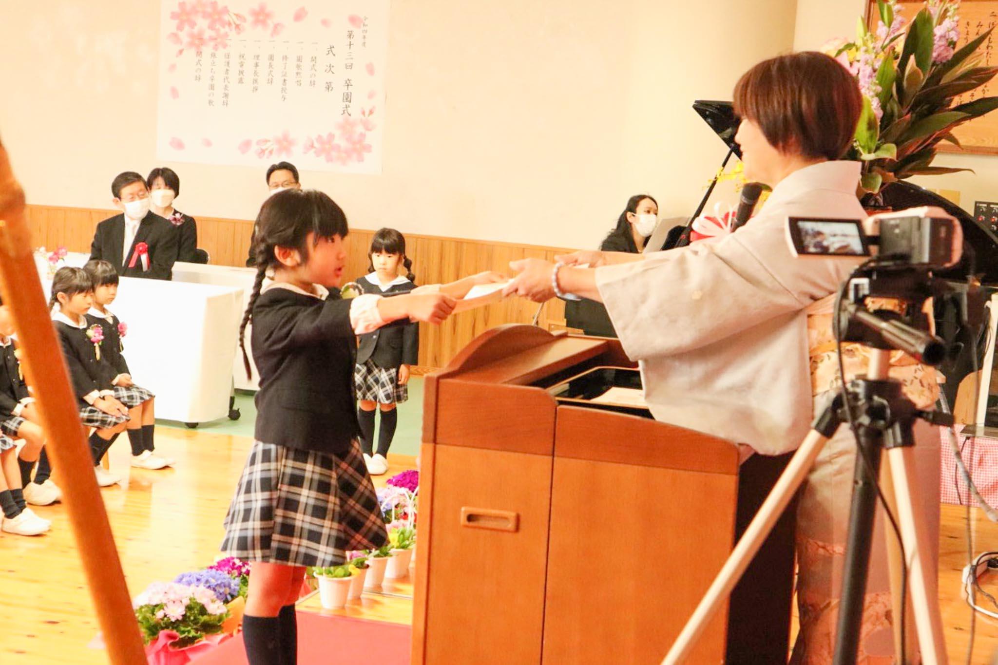 3月16日(木)、第13回卒園式を挙行しました。年長組の38人に谷川園長から「おめでとう」と一人一人に修了証書が授与されました。卒園児は保護者席に進み、「これから一年生になります」「お母さんのこと大好き」「いつも幼稚園に送ってくれてありがとう」など感謝の言葉を添えて、お母さんやお父さんに修了証書を手渡しました。