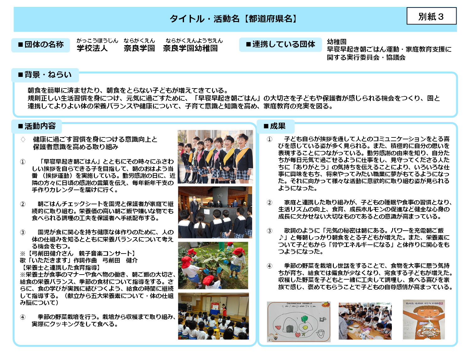 奈良県知事を表敬訪問し、園児達が「朝のおはよう挨拶当番」の活動、「野菜の栽培とクッキング」といった食育の活動、「勤労感謝の日に周辺の店舗や病院などに園児が作った干支のカレンダーを感謝の言葉と共に配布する」活動、「家庭でお手伝いをしてそれを描いて発表する」活動など多岐にわたる活動を報告した。