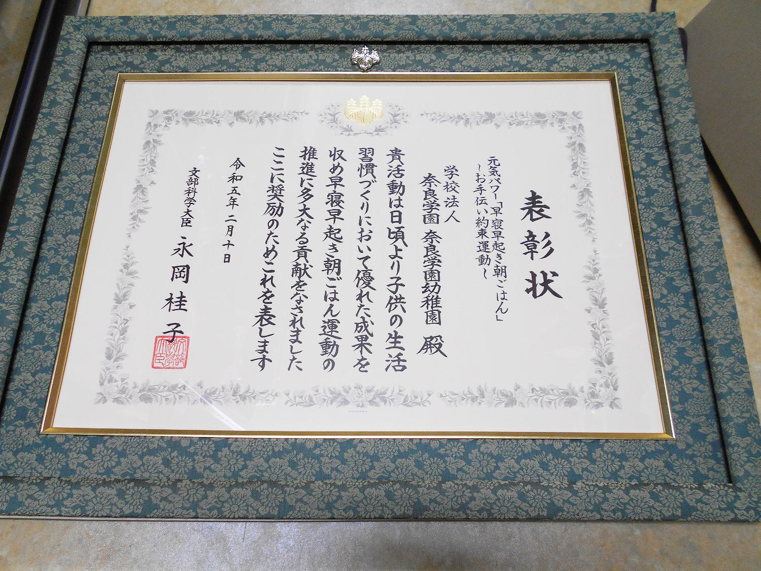 この表彰を機に、奈良学園幼稚園がますます基本的生活習慣や規範意識の醸成への意識が高まることを願っている。