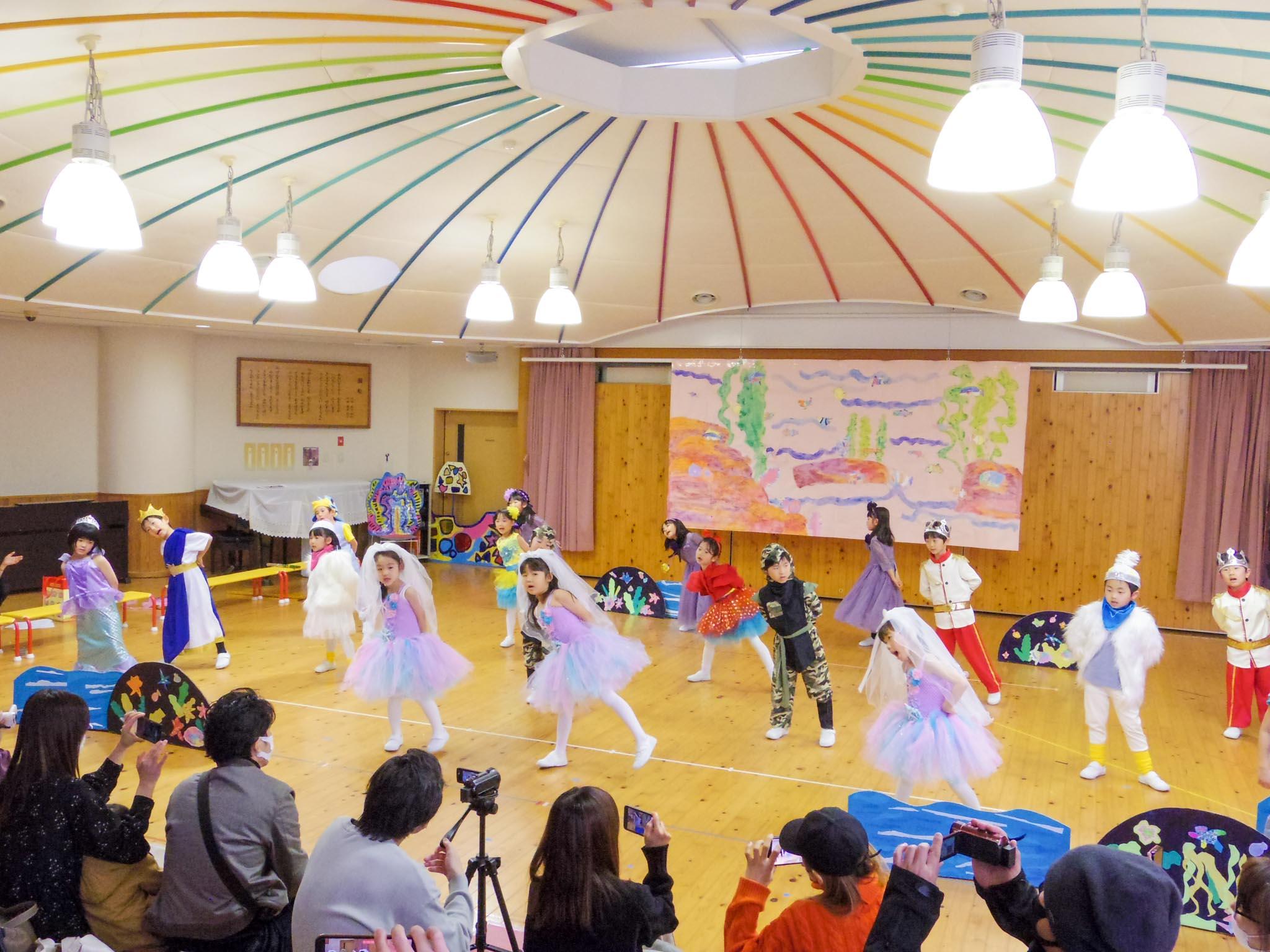 かわいらしい衣装を身に着けた園児たちは、アリエルの姉妹や宮廷音楽家のセバスチャン、ウツボの双子フロットサムとジェットサムなど、個性豊かな役柄を生き生きと演じました。アースラとの対決シーンやクライマックスでのダンスなど、華やかな場面では会場が大いに盛り上がりました。最後には、カーテンコールで一人ひとりがお辞儀であいさつをしました。