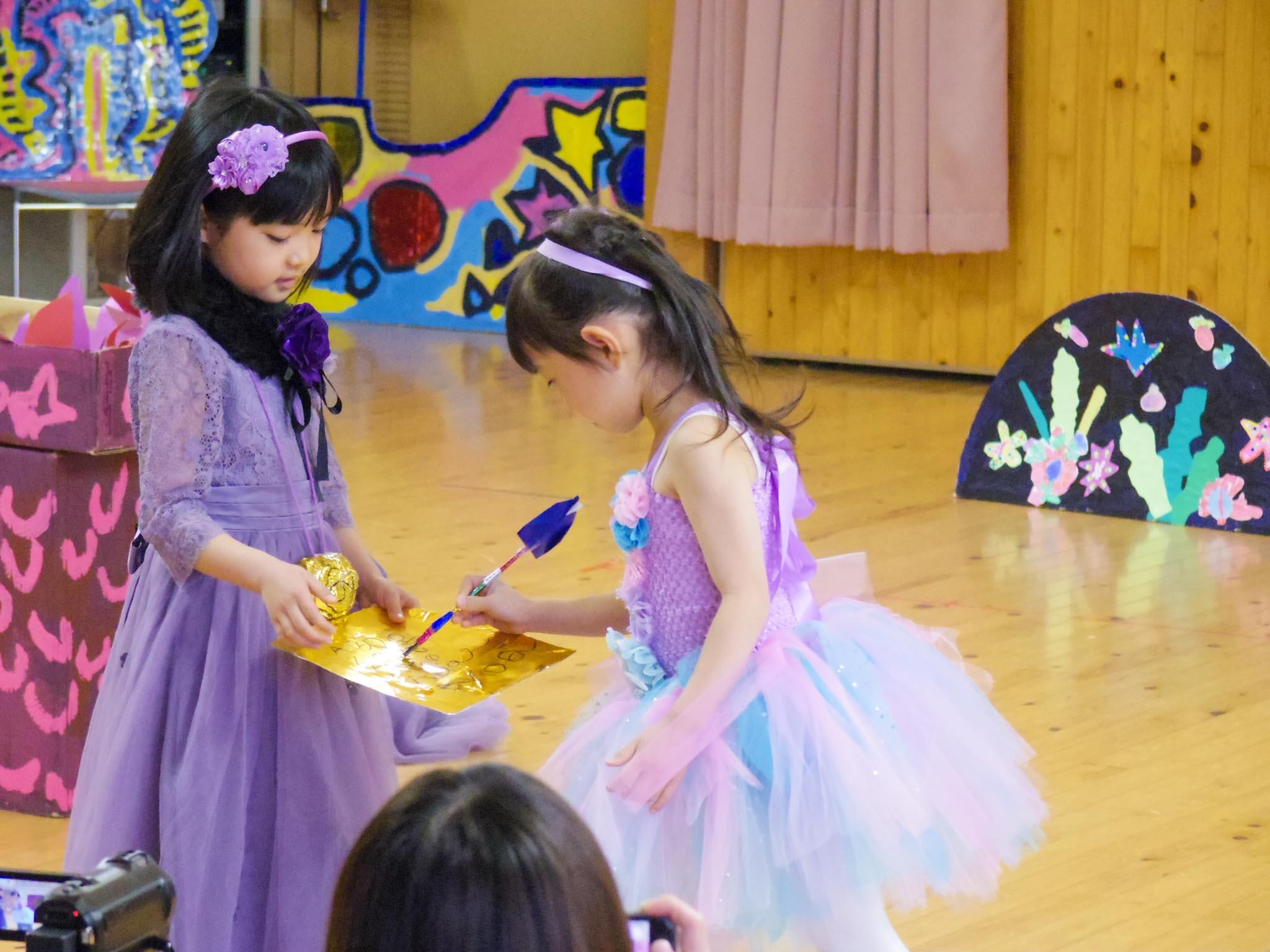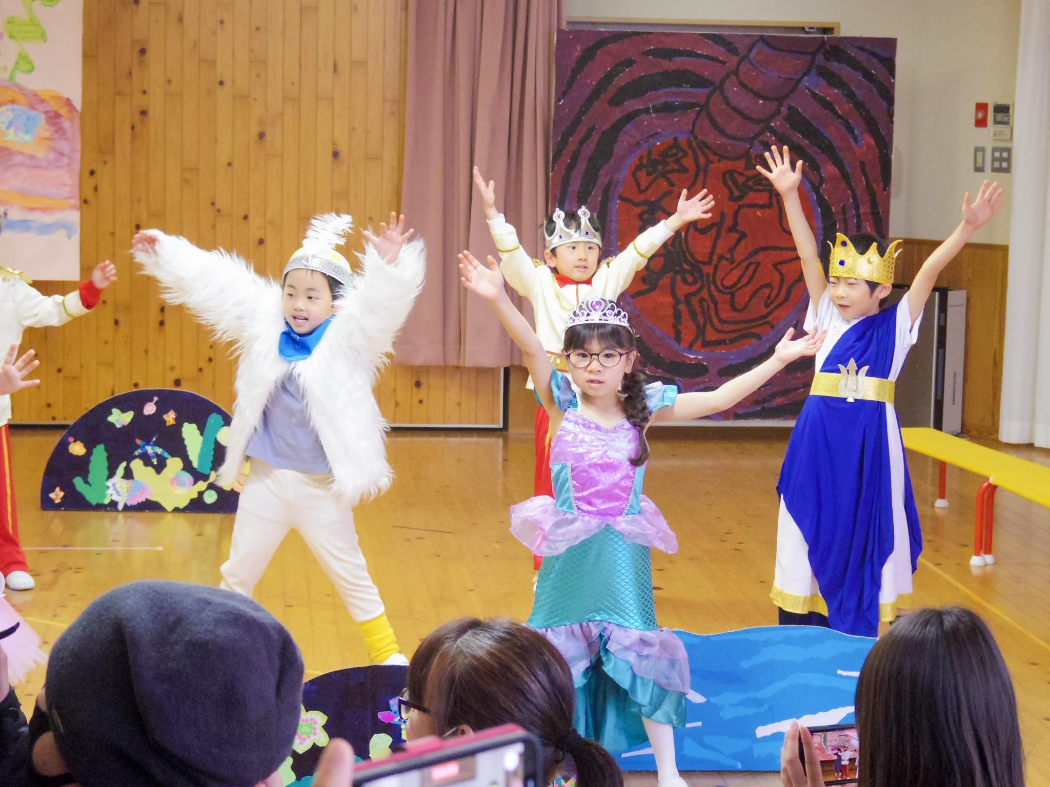 年長児そら組の演目は「リトル・マーメイド」でした。アトランティカの王・トリトンの末娘であるアリエルは、人間の世界にあこがれる人魚姫です。友だちである魚のフランダーと一緒に人間の乗る船を眺めていたアリエルは、嵐でおぼれかけた王子エリックを助け、王子に恋をしてしまいます。魔女アースラとの契約で、美しい声と引き換えに人間の脚を手に入れたアリエルでしたが、声が出せないため王子を助けたのが自分であると伝えることができません。そこへアリエルの歌を手に入れたアースラが人間の姿になって現れ、アリエルとアトランティカは危機にさらされるのでした。