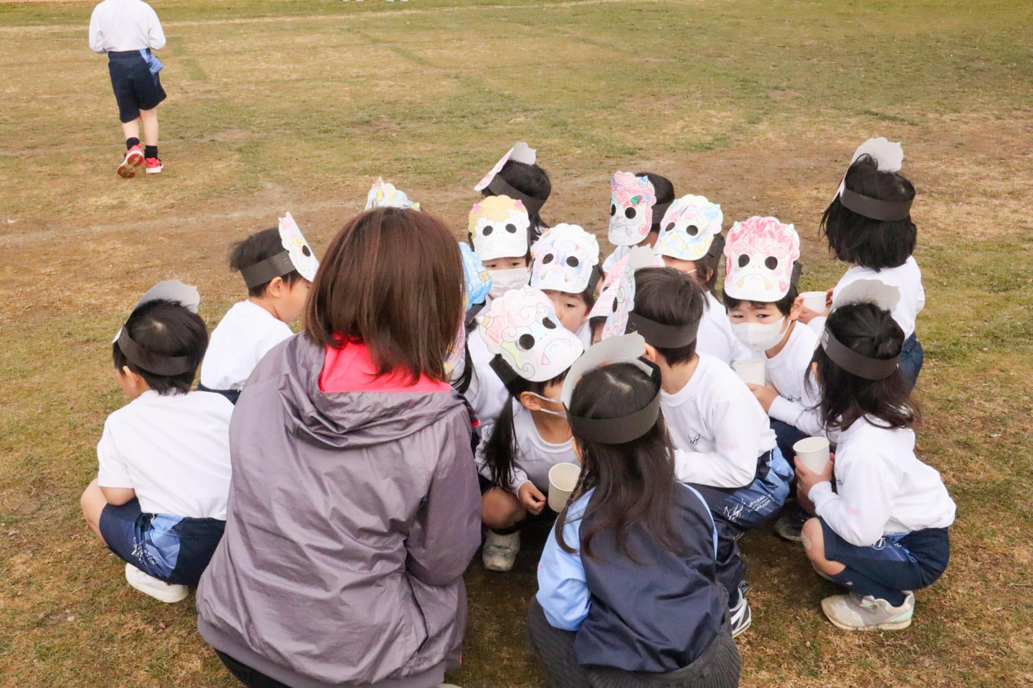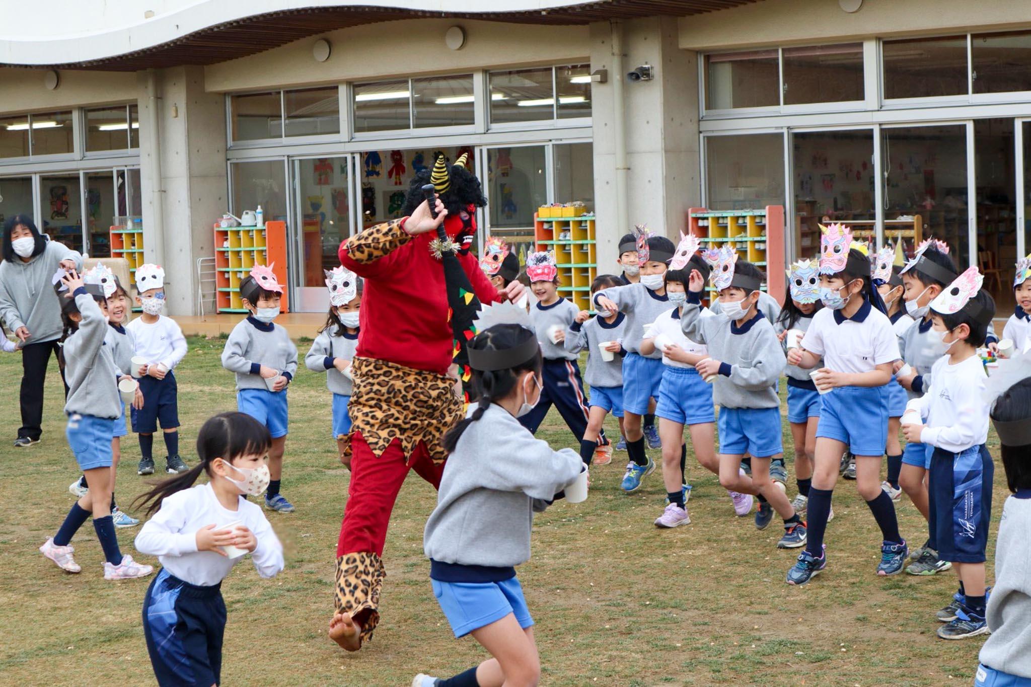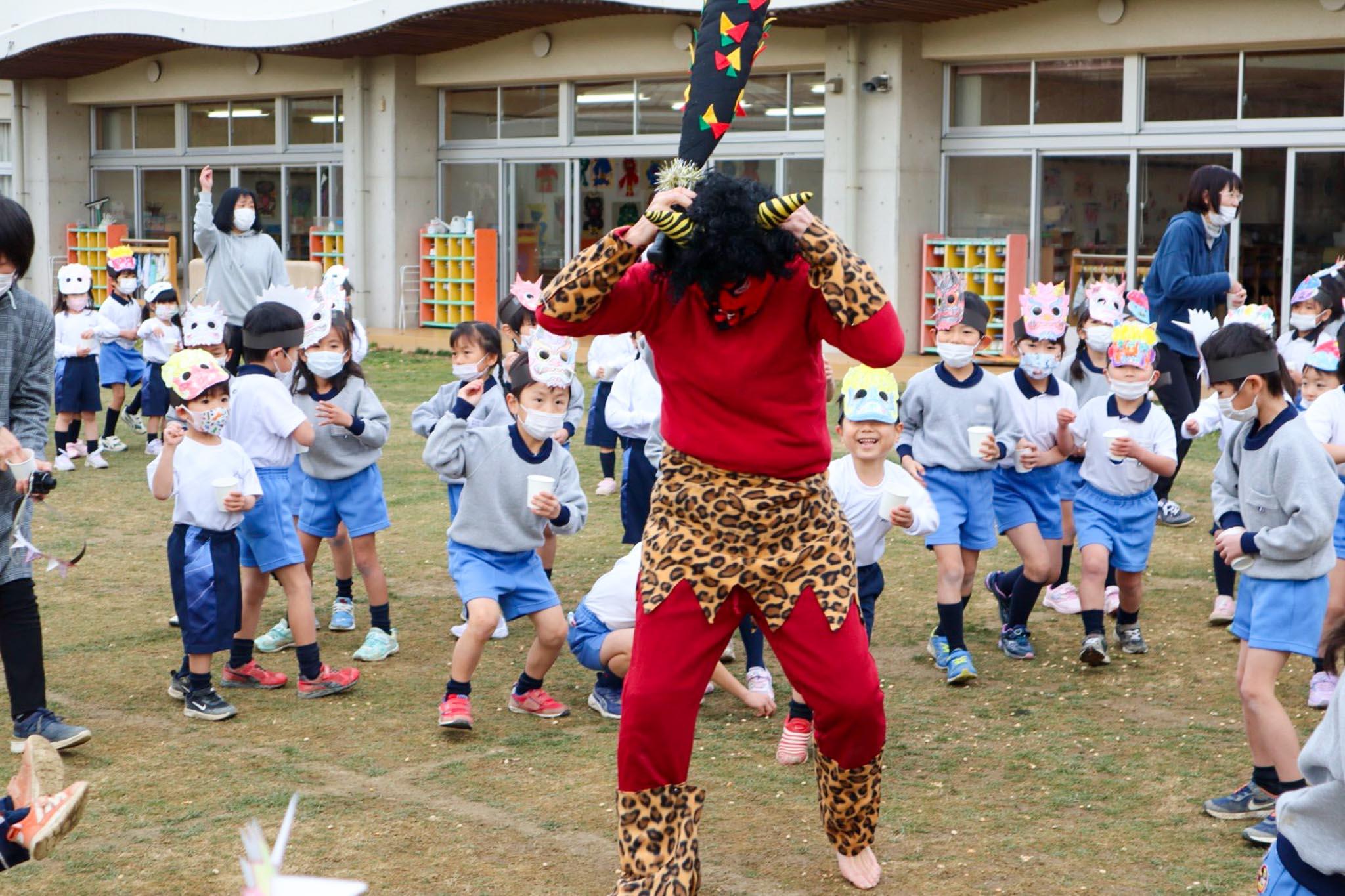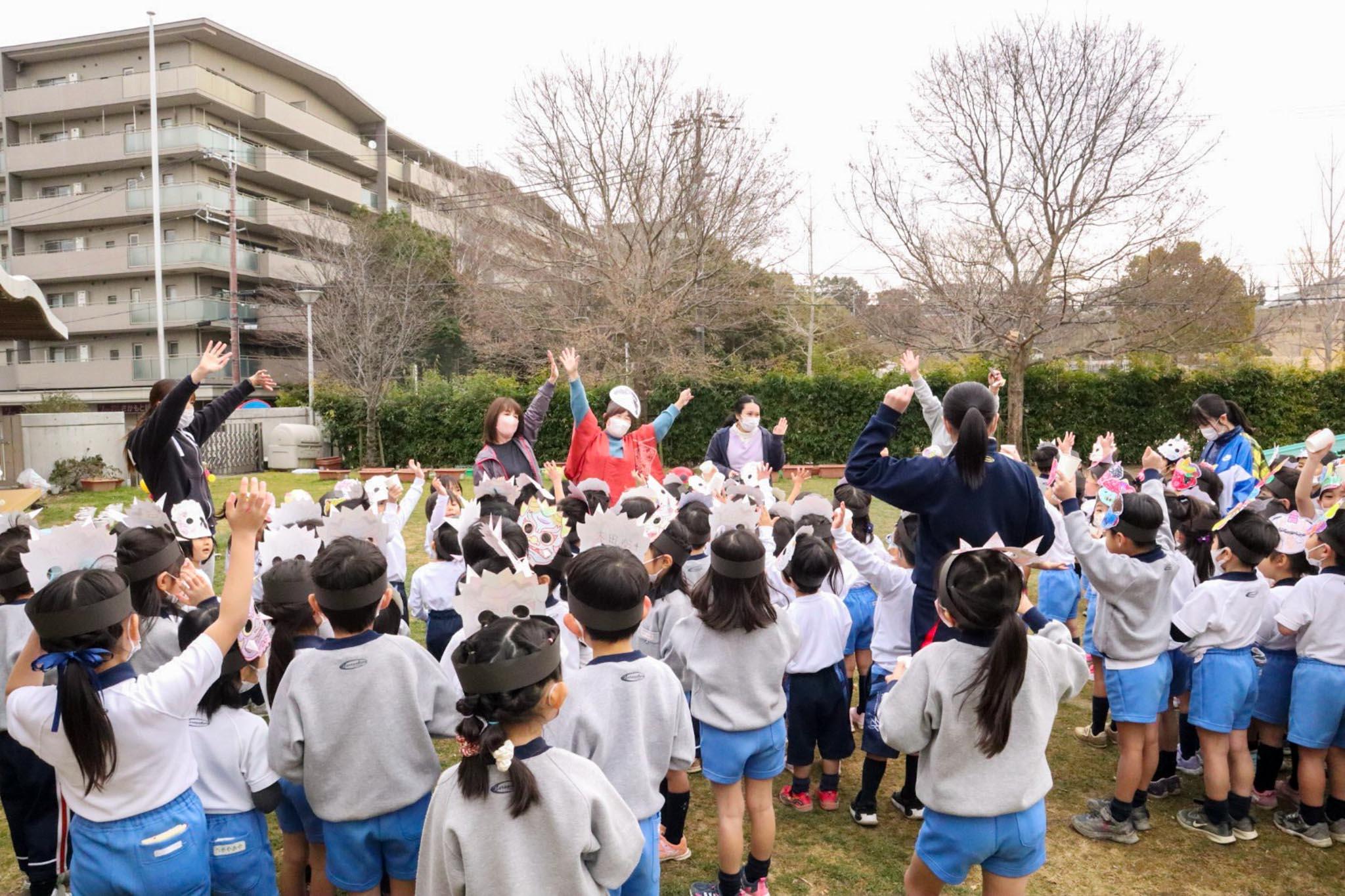 2月3日(金)、節分の日の会を行いました。手作りの鬼のお面をつけた園児たちが園庭に集まりました。