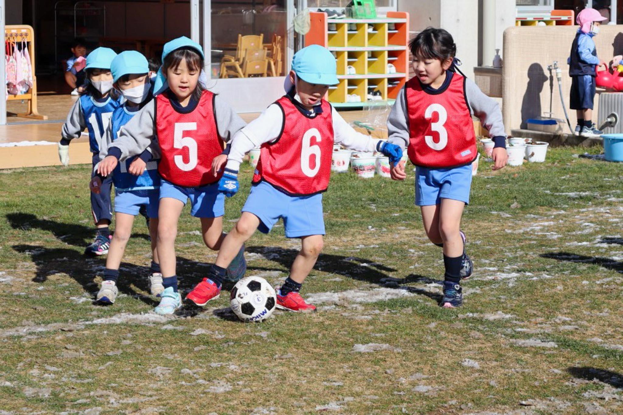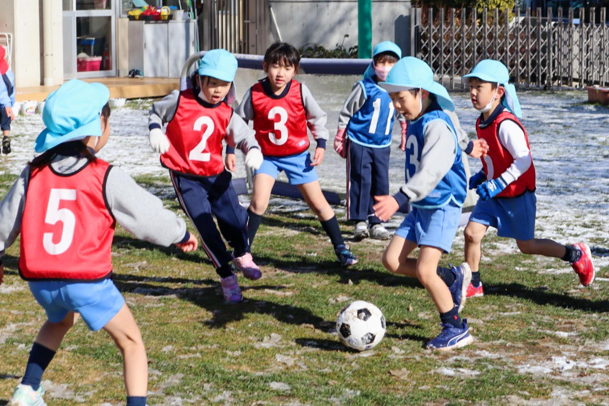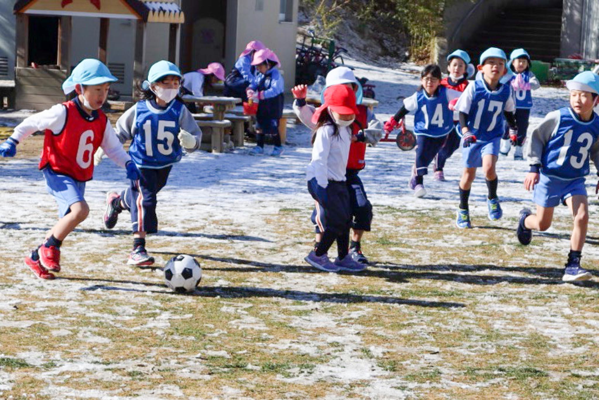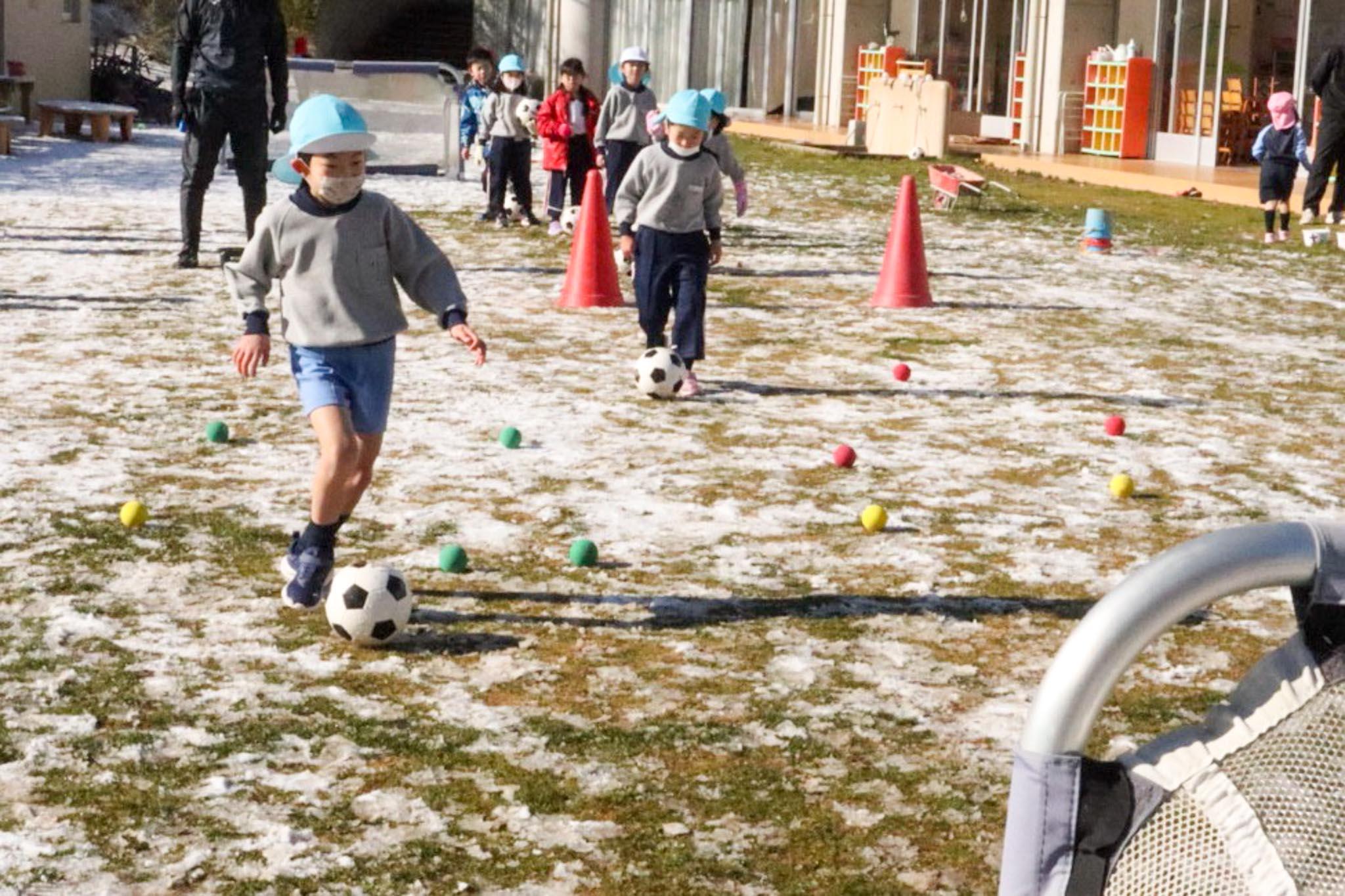 昨夜から降っていた雪が薄く積もった園庭に、サッカーボールを抱えた子どもたちが集まってきました。「よし!今日は雪上サッカーだな」という先生の声に、みんな寒さも忘れて心ウキウキです。